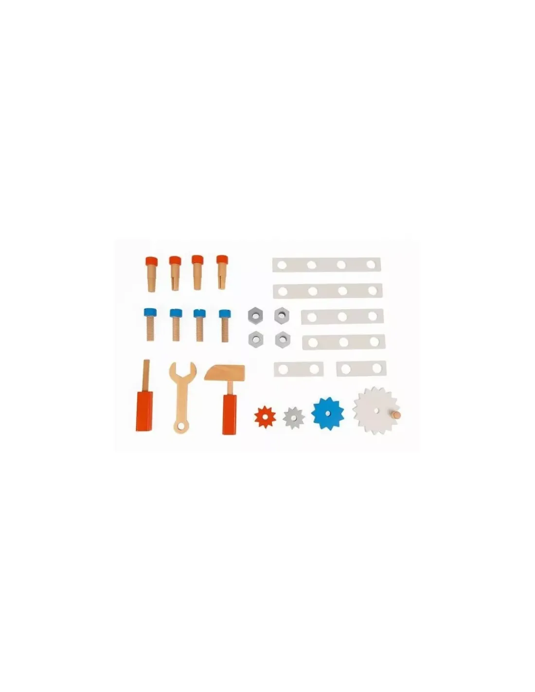 Cet établi sur roulettes est livré avec 3 outils magnétiques (marteau, tournevis et clé), un étau, un système d’engrenage composé de 4 roues et de 18 accessoires (4 clous, 4 vis, 4 écrous, 2 plaquettes à 2 trous, 2 plaquettes à 3 trous et 2 plaquettes à 4 trous).