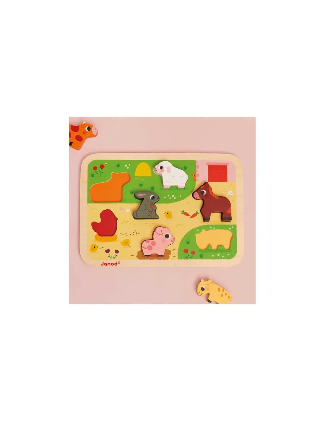 Découvrez le Chunky puzzle La ferme de Janod, un puzzle d’encastrement en bois avec 7 grosses pièces à replacer dès 18 mois.