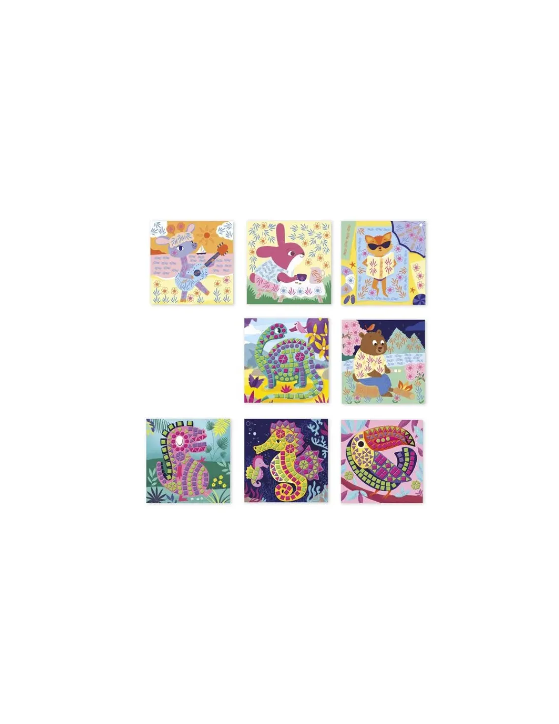 La mosaïque et les tampons, des activités créatives très appréciées des enfants. C’est pour cela que Janod, en partenariat avec Hachette, a conçu ce coffret destiné aux filles et aux garçons de 5 ans. Votre enfant va s’amuser à compléter de jolies scènes colorées sur le thème des animaux. Il s’amusera à réaliser les 4 premiers tableaux à l’aide de gommettes en mousse et les 4 suivants avec un encrier à doigts et des tampons encreurs.