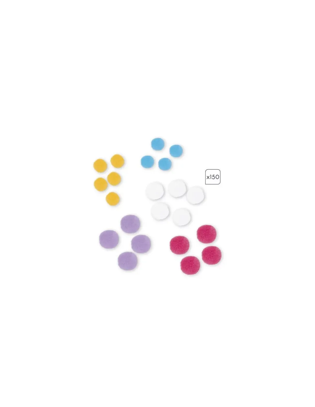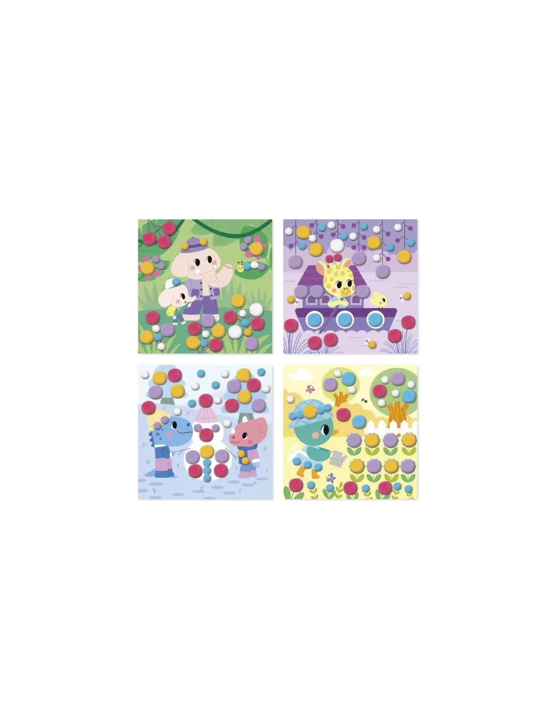 Un coffret contenant 4 tableaux autocollants à décorer avec 150 pompons colorés de 2 tailles pensées pour les petites mains.
