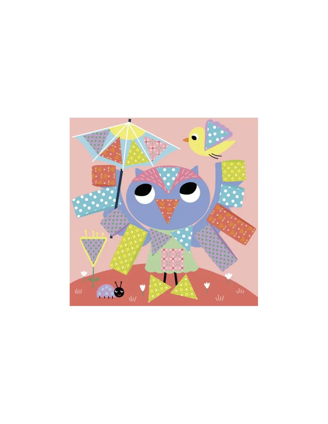 Un coffret contenant 4 tableaux à compléter, 6 feuilles de papier à motifs, une paire de ciseaux en plastique et un bâton de colle.