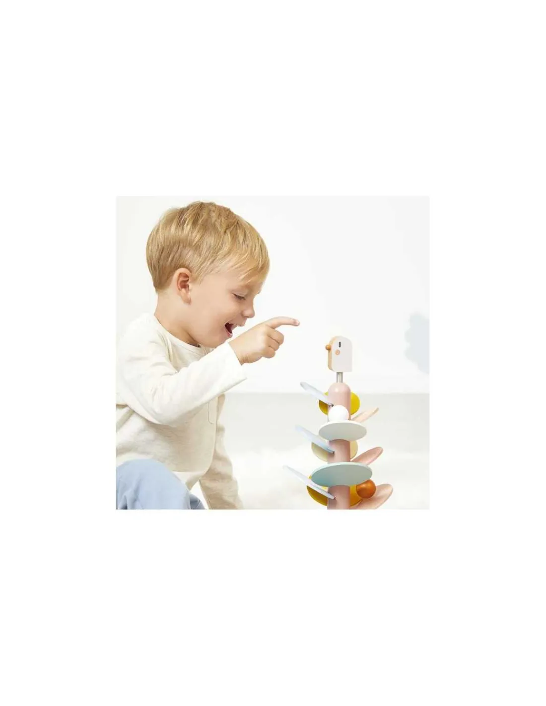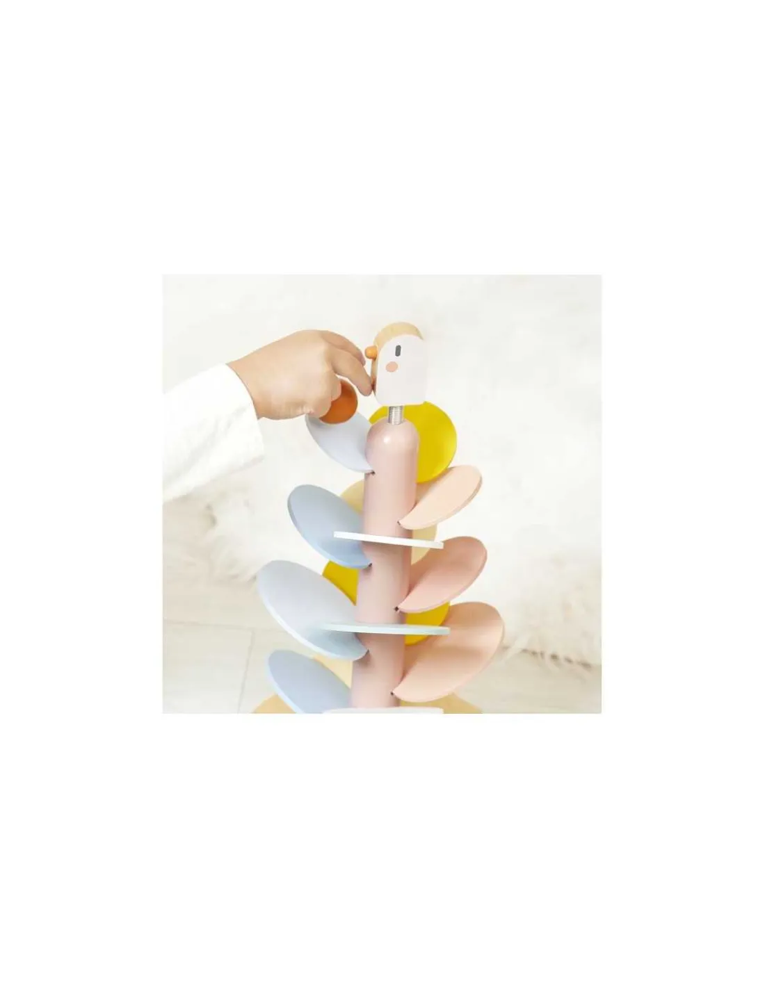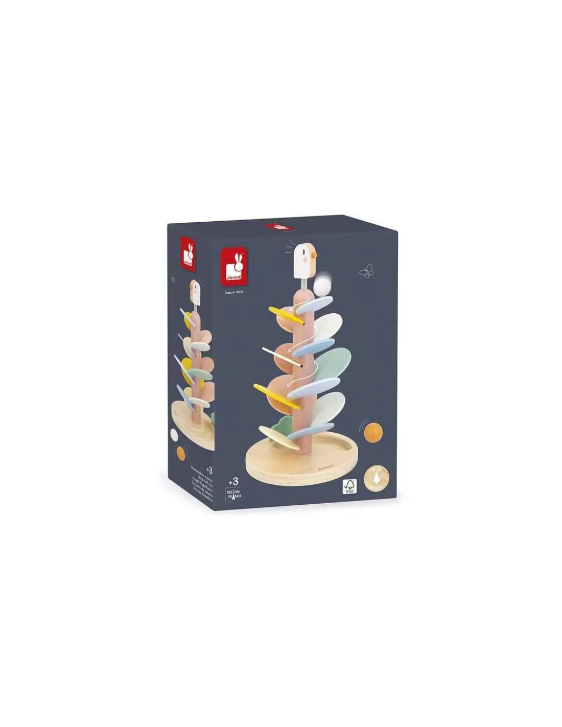 L’oiseau, perché sur un ressort, apporte une touche amusante et dynamique, tandis que deux billes en bois sont incluses pour expérimenter la descente sur les feuilles.