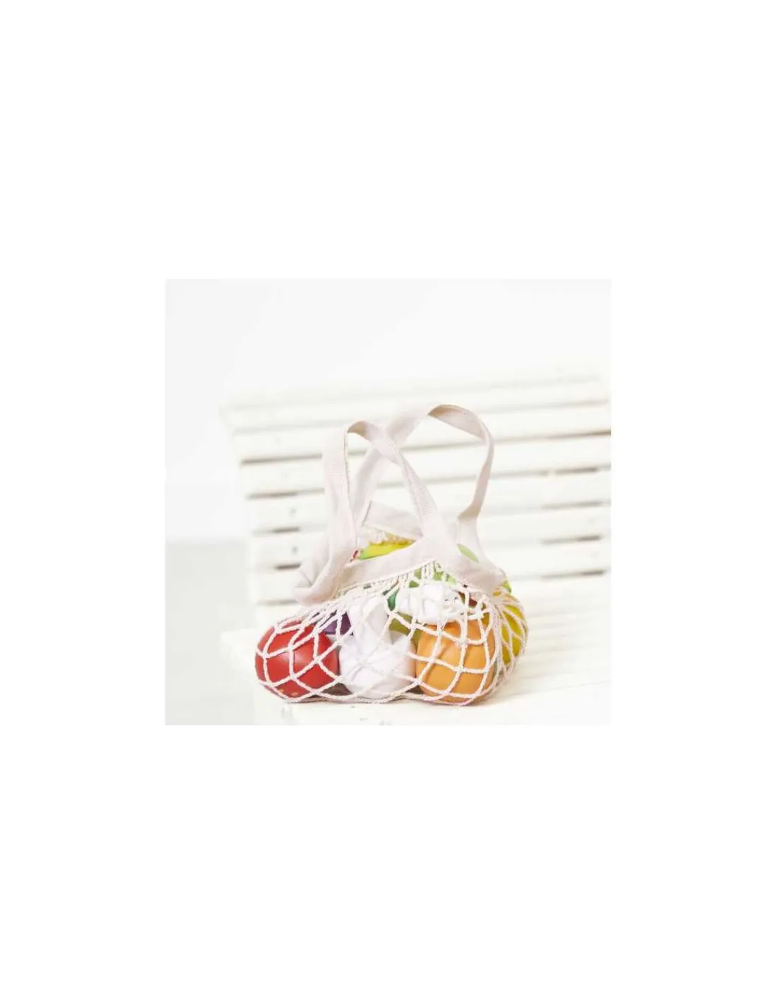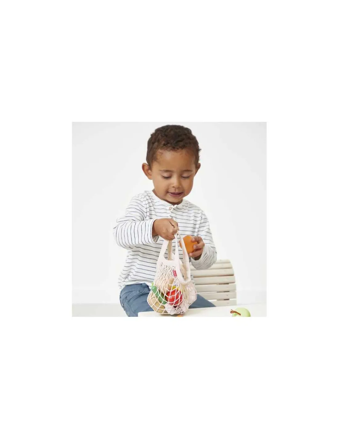 Découvrez le filet de fruits et légumes de la collection Mamie Soleil de Janod, un coffret de jouets en bois sur le thème du marché idéal pour les enfants dès 3 ans.