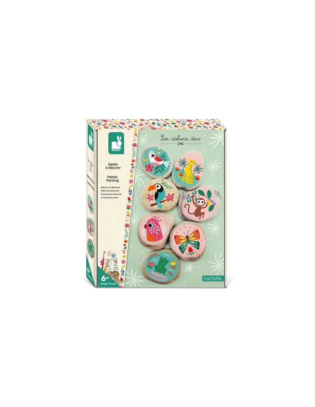 Découvrez le coffret créatif Galets à décorer de la collection Les ateliers déco de Janod, une activité créative pour les enfants dès 6 ans. Votre enfant va s’amuser à décorer les 7 galets à l’aide de la peinture et des transferts.