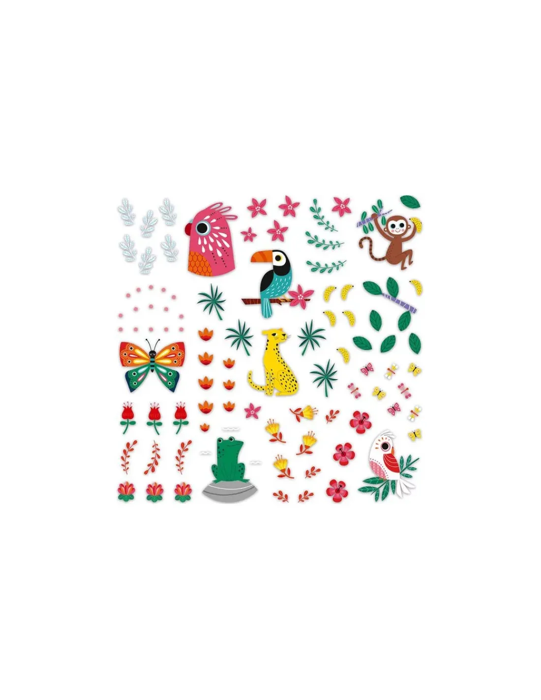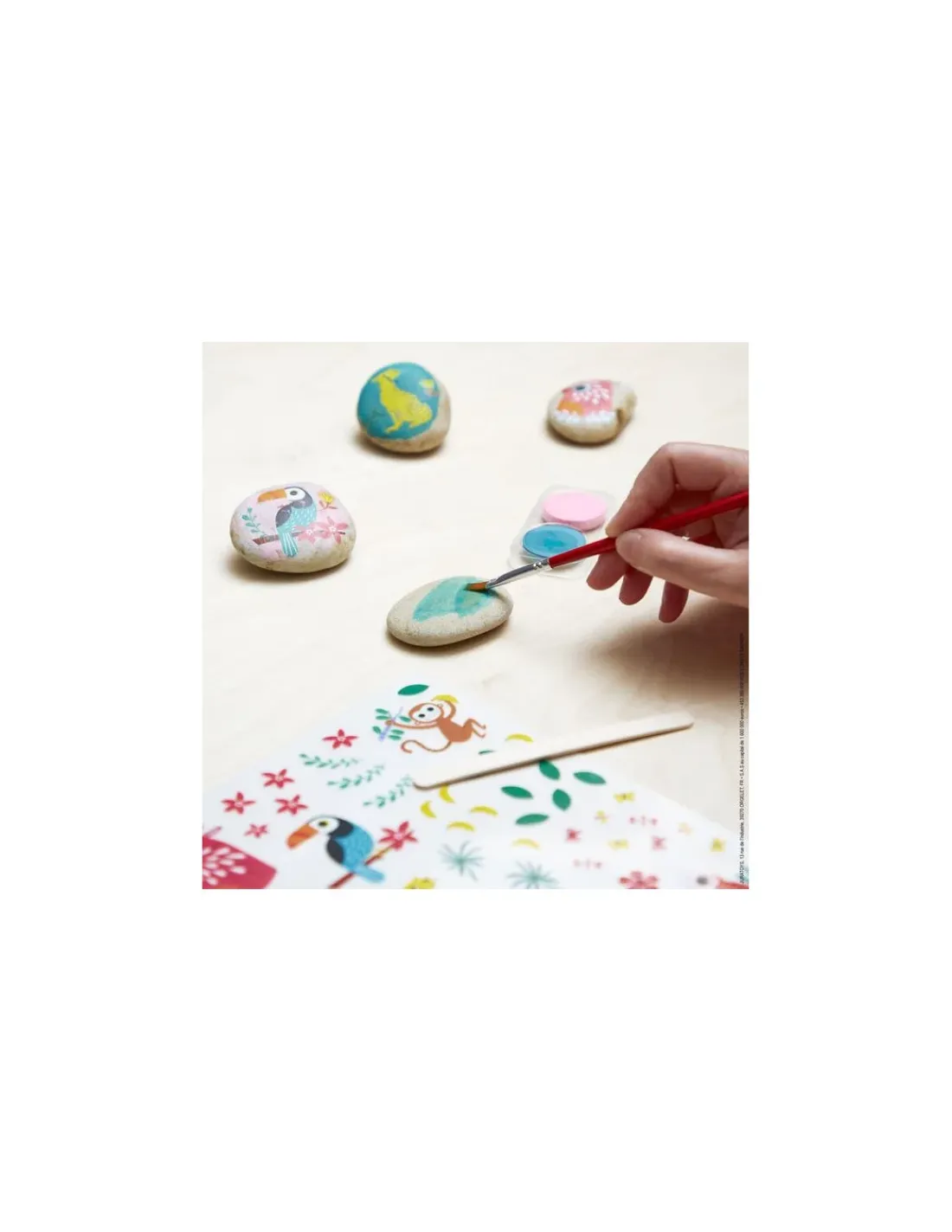 Ce kit de création contient 7 galets, 1 planche de transfert (animaux, fleurs, feuilles…), 1 bâtonnet en bois, 2 godets de peinture, 1 pinceau et 1 livret.