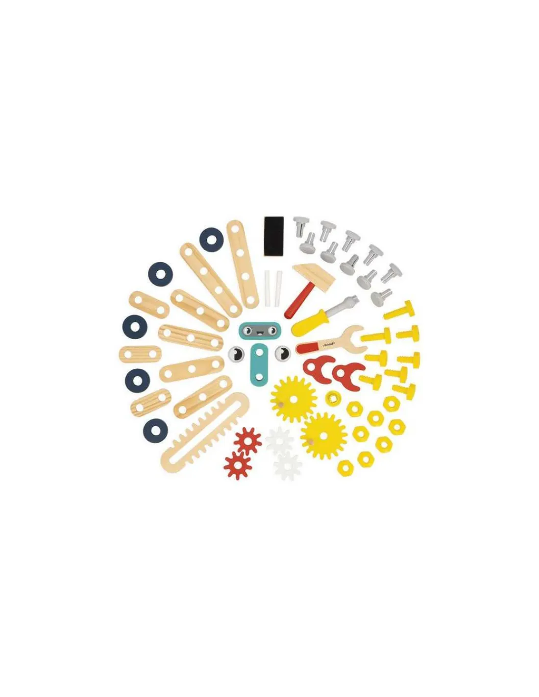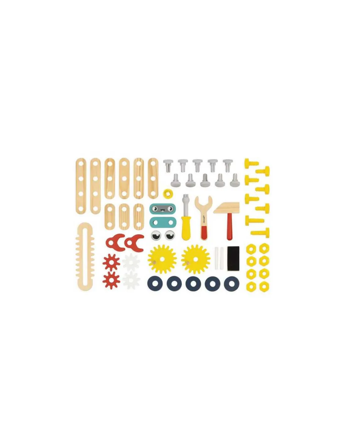 Le coffret comprend 1 établi, 3 outils magnétiques, 18 pièces en bois, 30 éléments en plastique, 2 craies, une brosse et 1 petit robot à assembler composé de 7 pièces.