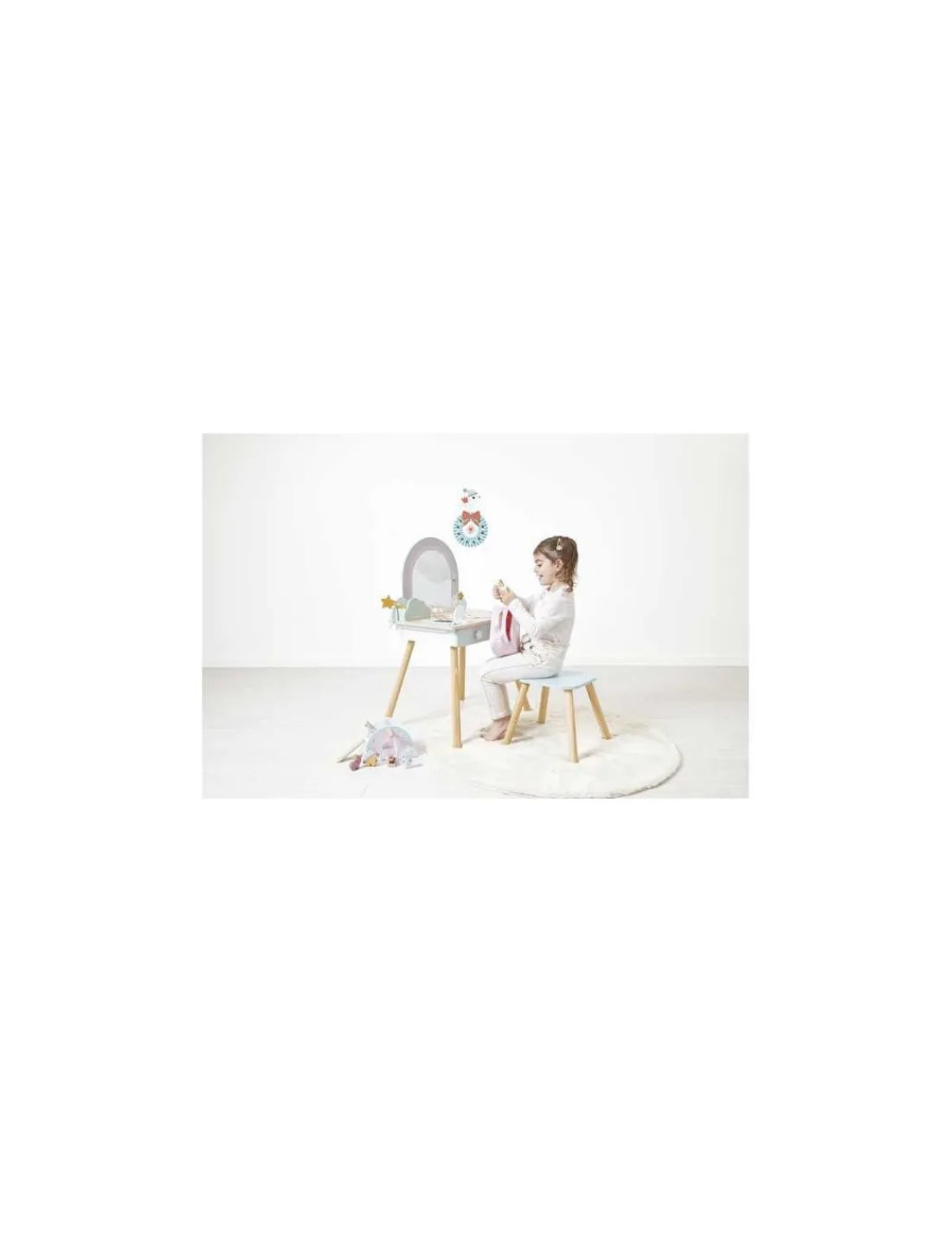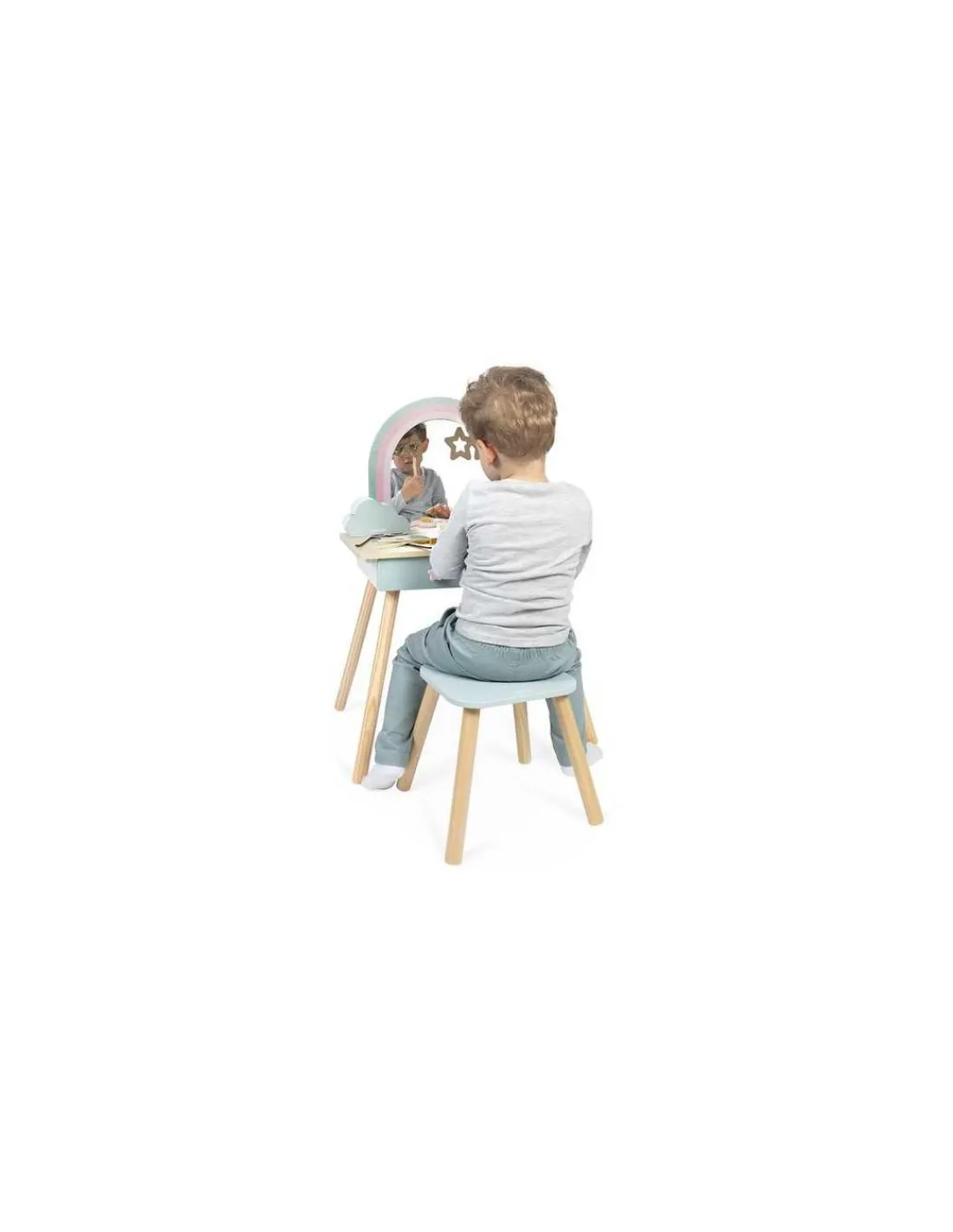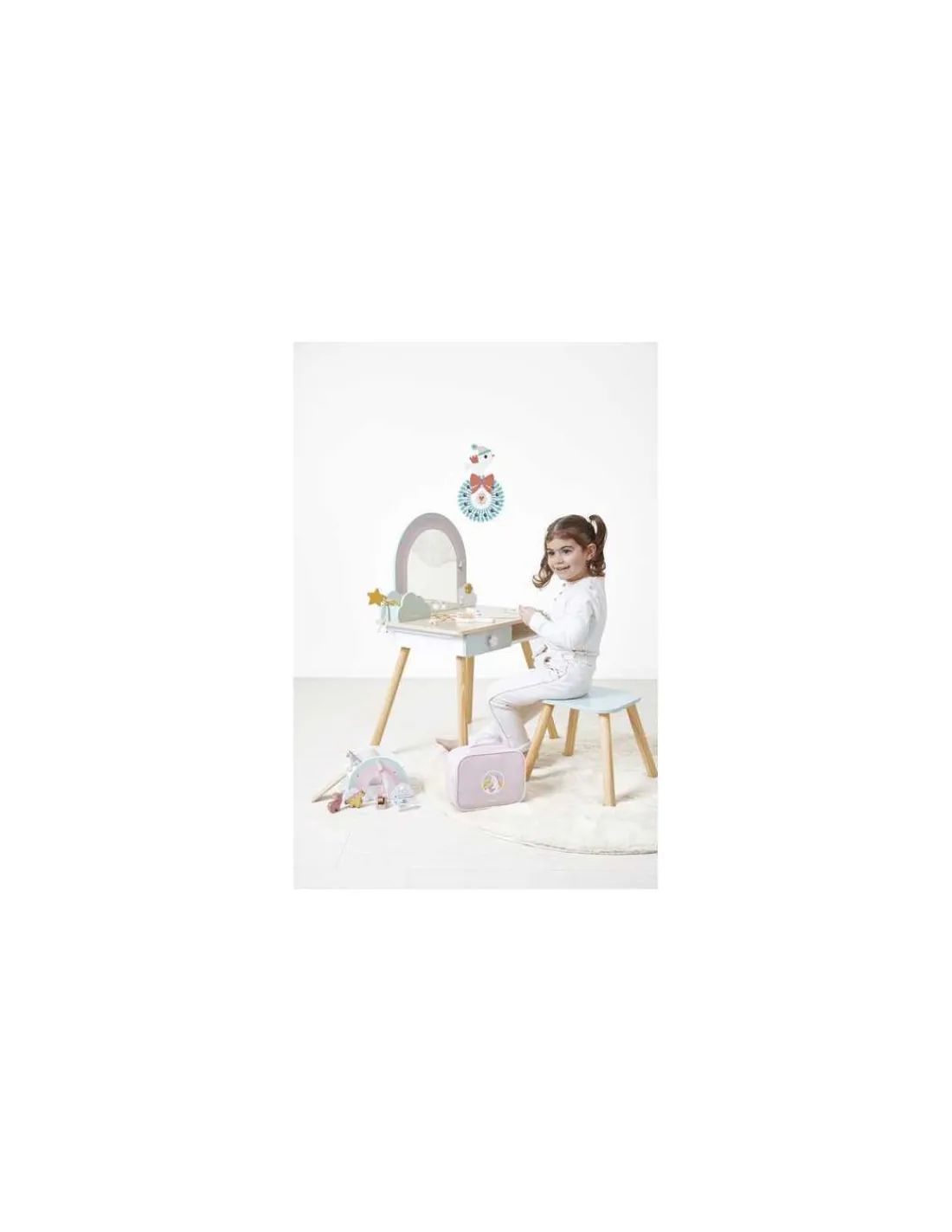 Découvrez la grande coiffeuse Licorne de Janod, une magnifique coiffeuse en bois accompagnée de son tabouret assorti, spécialement conçue pour les enfants de 3 à 6 ans. Ce meuble sur le thème de la beauté invite les enfants à imiter les grands en se maquillant, se coiffant et en s’amusant avec style.