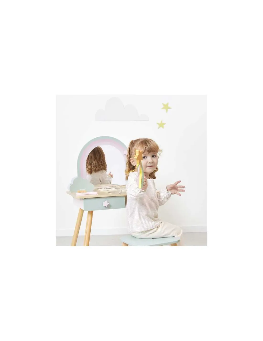 Cette coiffeuse pleine de surprises est équipée d’une trappe secrète magnétique qui s’ouvre à l’aide de l’un des 4 aimants fournis, d’un tiroir pratique et d’un rangement en forme de nuage. Son superbe miroir arc-en-ciel ajoute une touche féérique, complétée par des accessoires magiques : 4 magnets (3 étoiles et 1 licorne), une brosse à cheveux, une baguette magique et 3 accessoires de photobooth.