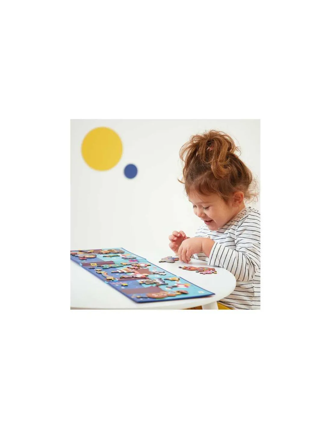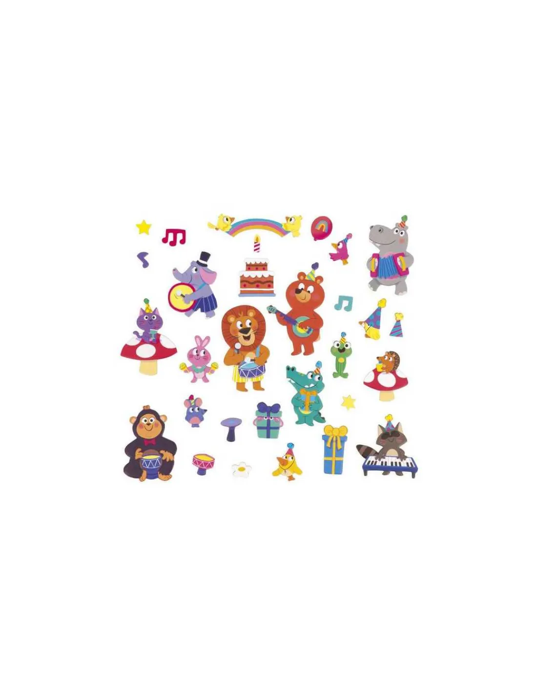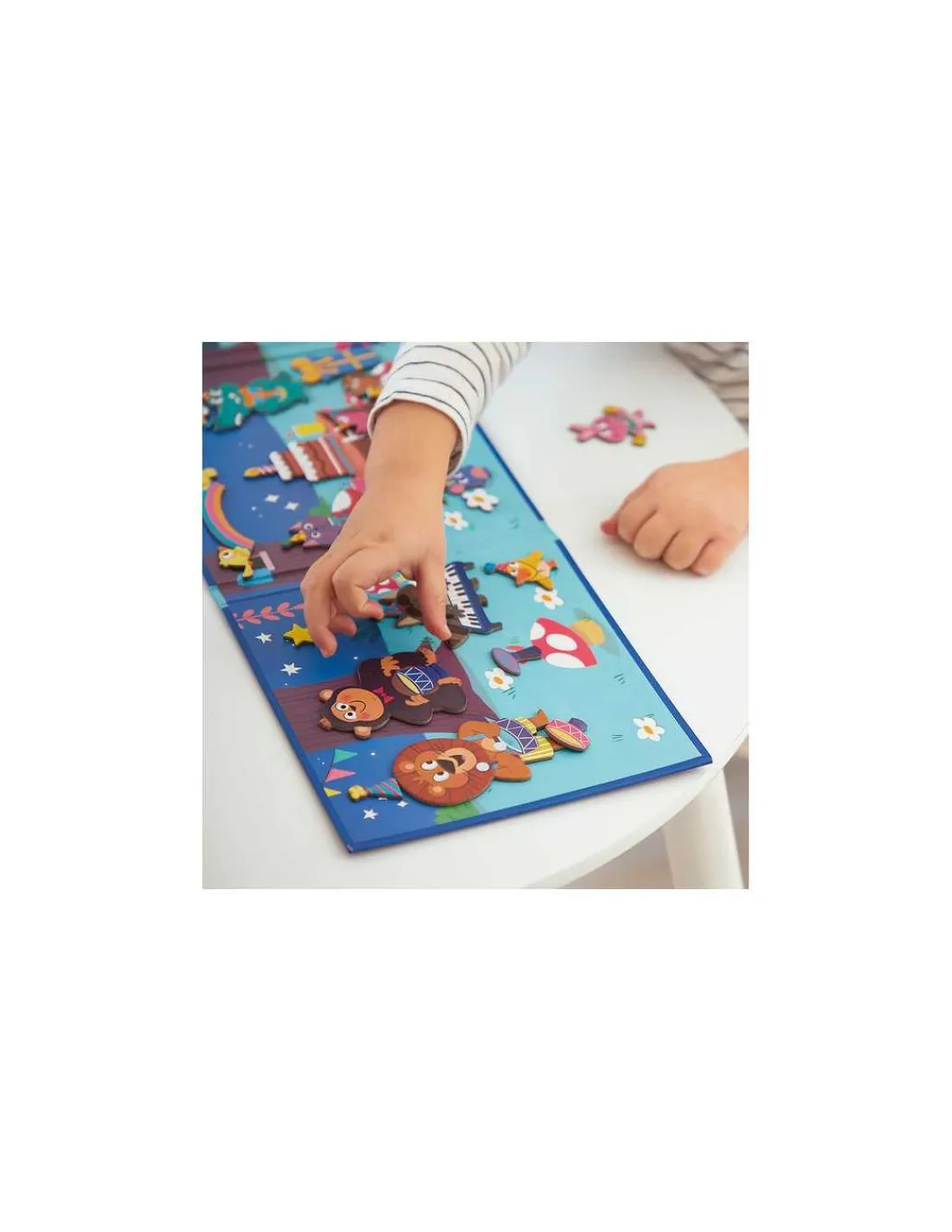 En ouvrant ce livre magnétique, votre enfant découvrira un joli décor festif, sur lequel il placera les pièces aimantées pour reconstituer des scènes avec des animaux rigolos faisant de la musique, des cadeaux, un gâteau d’anniversaire, un arc-en-ciel, des étoiles, des notes de musique…