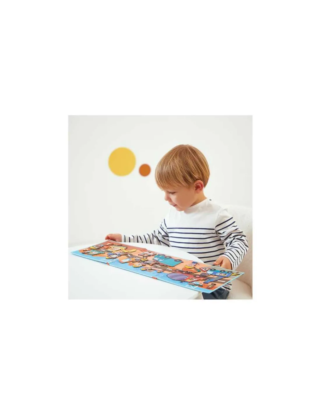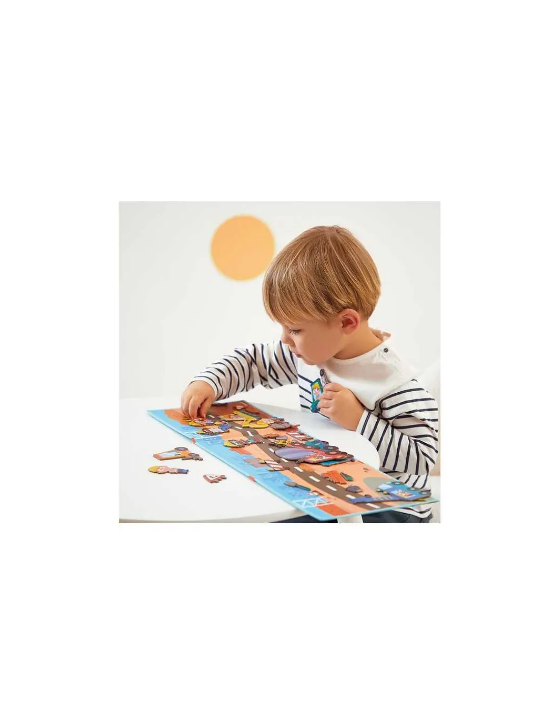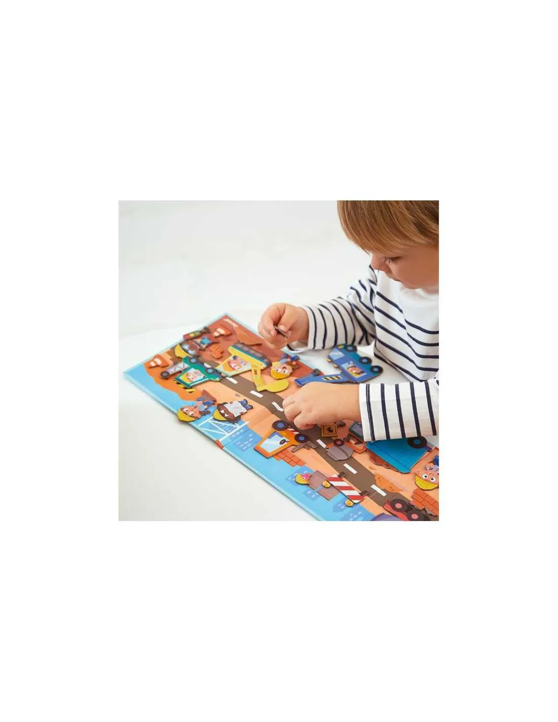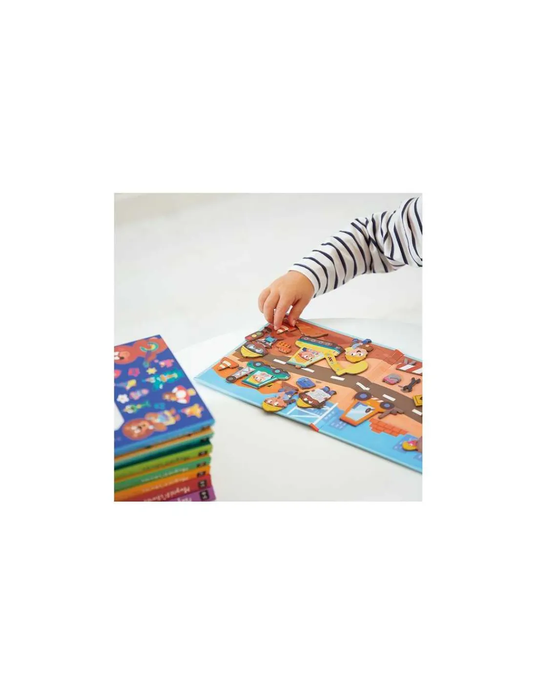 En ouvrant ce livre magnétique, votre enfant découvrira un joli décor, sur lequel il placera les pièces aimantées pour reconstituer des scènes de travaux avec des véhicules, des personnages…