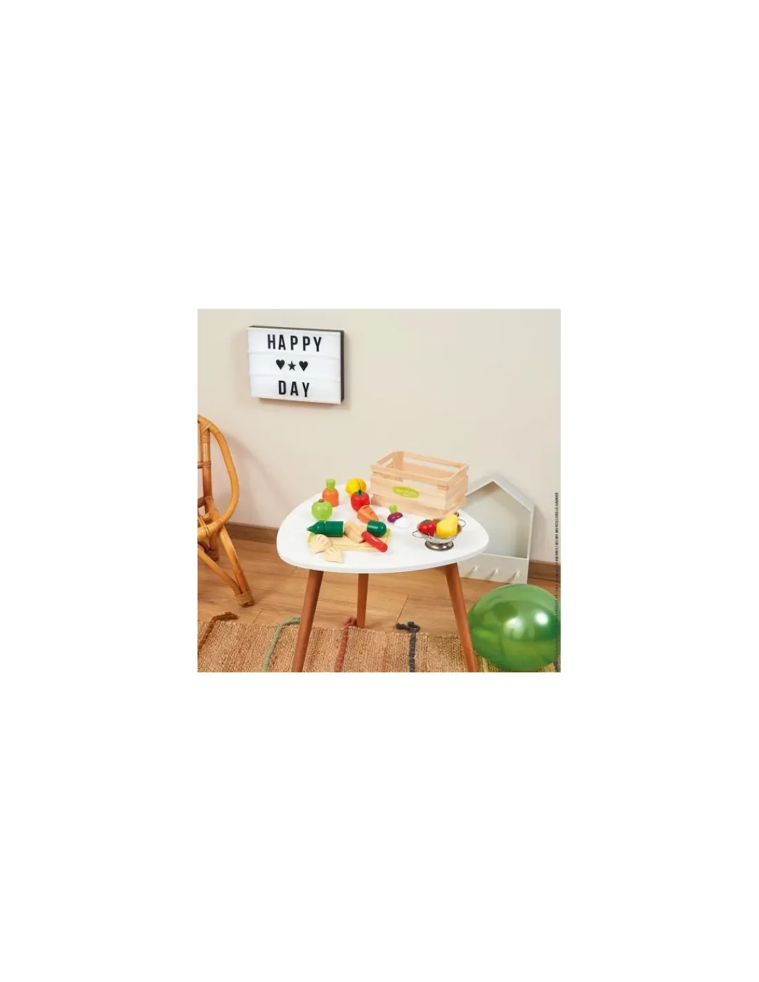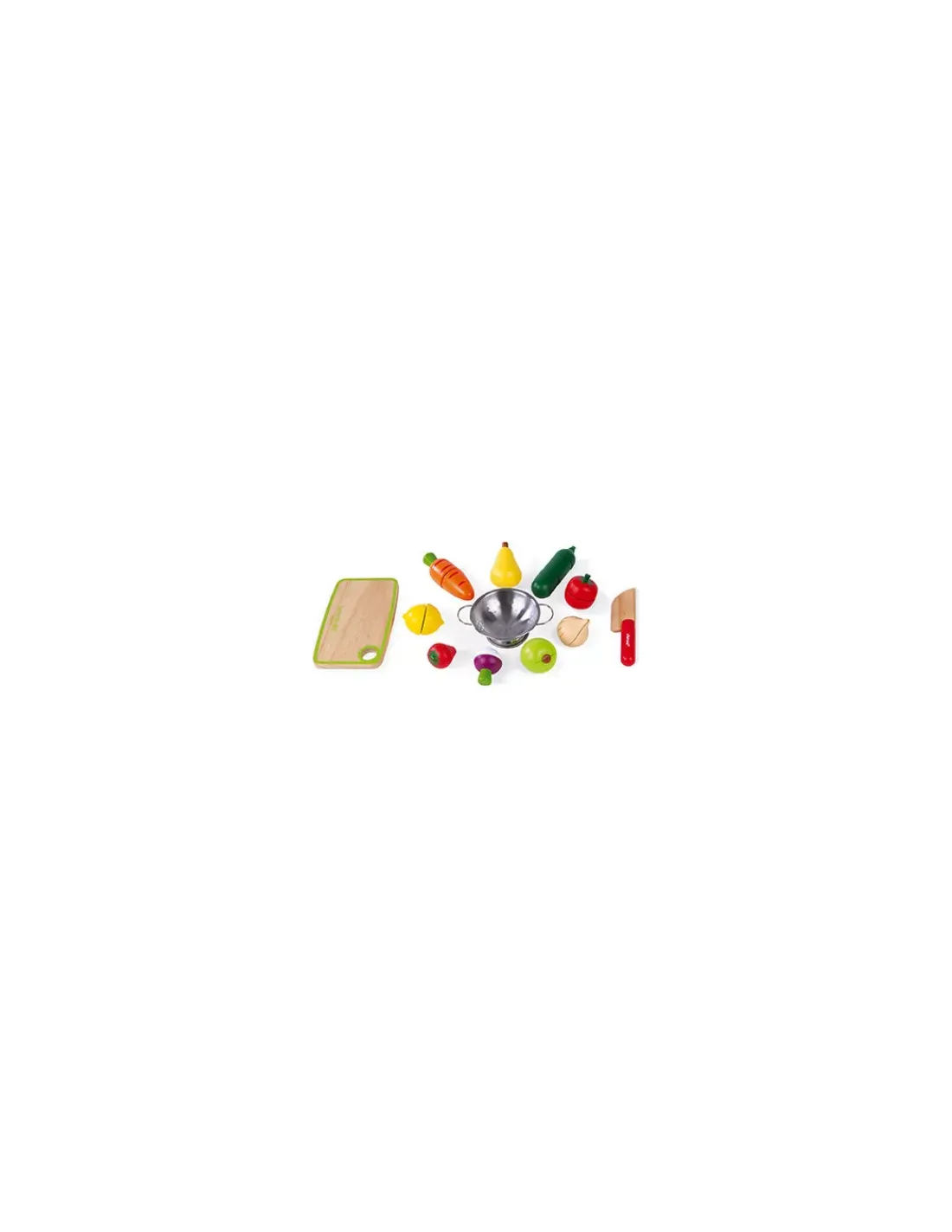 A l’intérieur de ce set, vous trouverez une cagette, une planche à découper, un couteau, une courgette, une carotte, une tomate, un navet, une poire, un citron, une pomme, une fraise et une passoire en métal. Les fruits et les légumes sont en bois et possèdent une partie en velcro, ce qui permet à l’enfant de couper facilement l’aliment comme les grands.