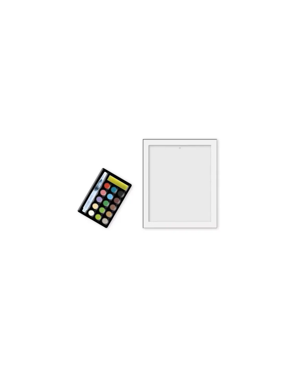Le coffret contient 2 tableaux à peindre, 1 palette de peinture aquarelle (15 godets, 1 éponge, 1 feutre-pinceau avec réservoir d’eau) et 1 cadre à peindre.
