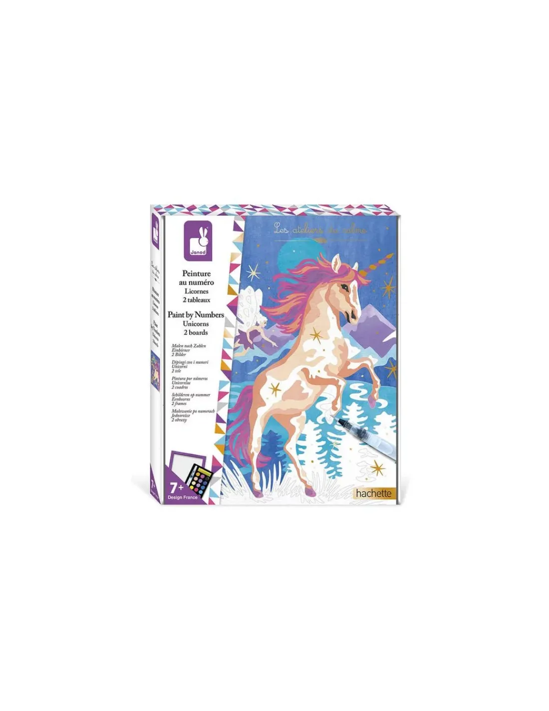 Découvrez le coffret peinture au numéro licornes de la collection Les ateliers du calme de Janod, une activité créative pour les enfants dès 7 ans, permettant de réaliser deux tableaux lumineux avec la célèbre créature légendaire.