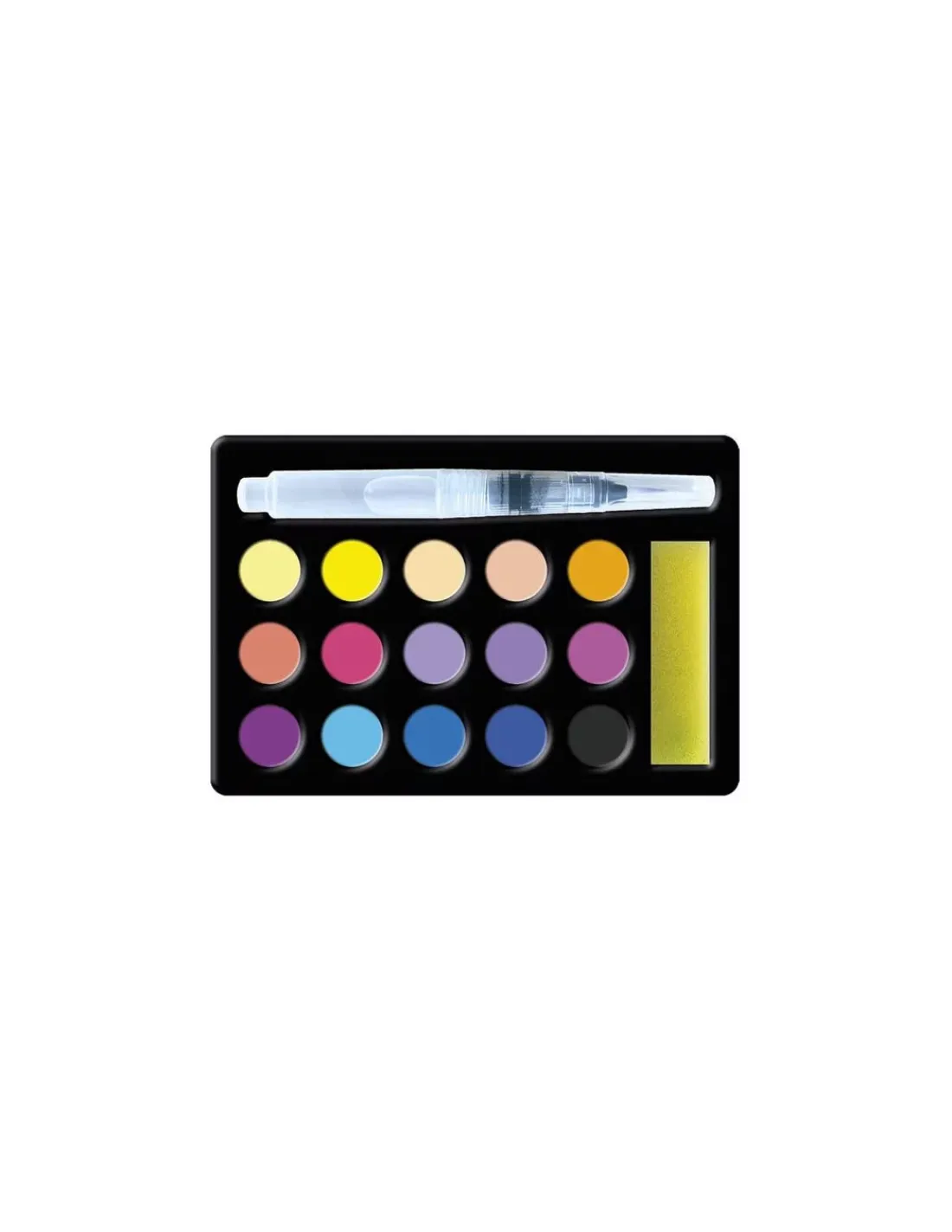 Un magnifique coffret de peinture composé de 15 godets de peinture aquarelle et d’un feutre-pinceau avec réservoir d’eau, qui permettra de développer la créativité de vos enfants.