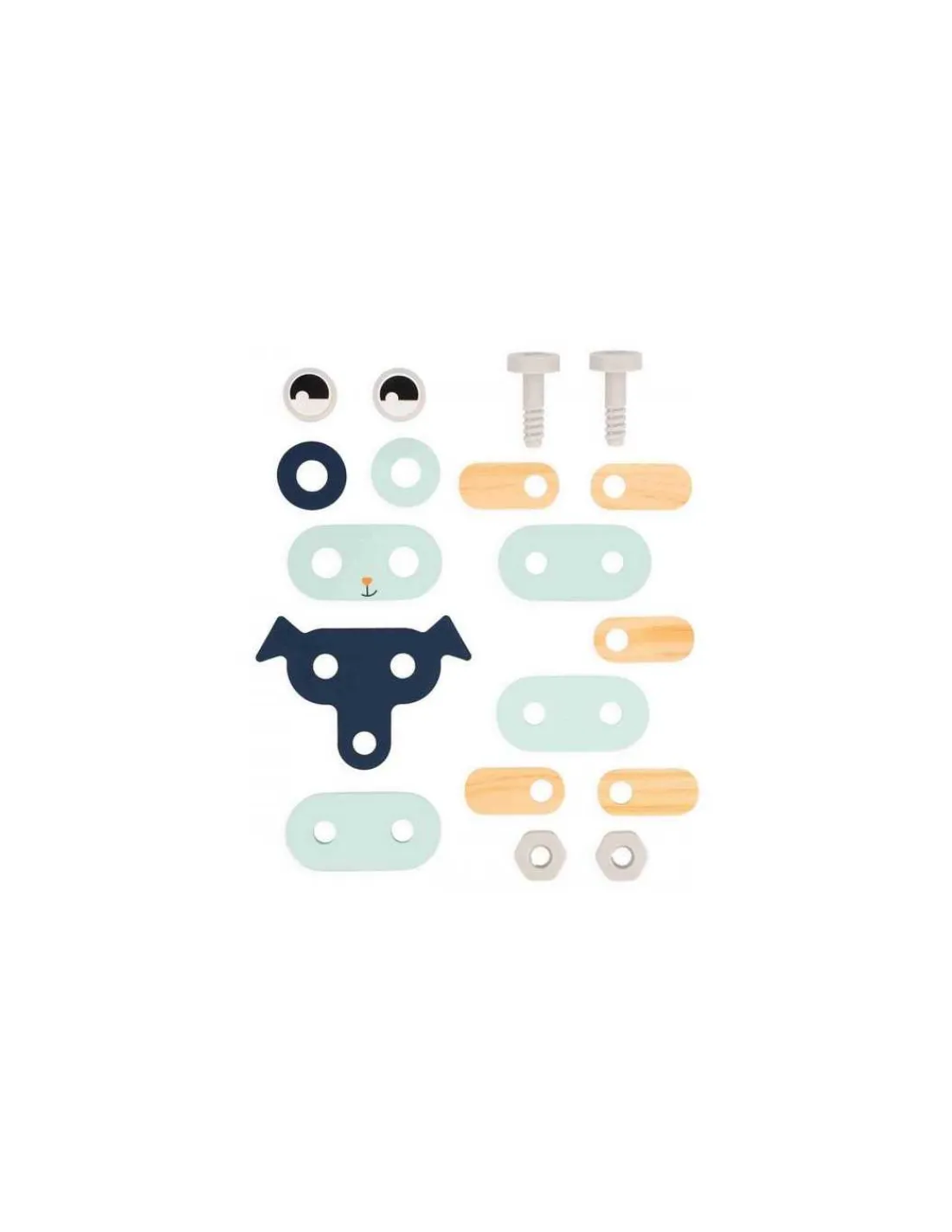 Le coffret comprend 3 outils, 32 pièces en bois, 18 éléments en plastique et des cartes « Modèle ».