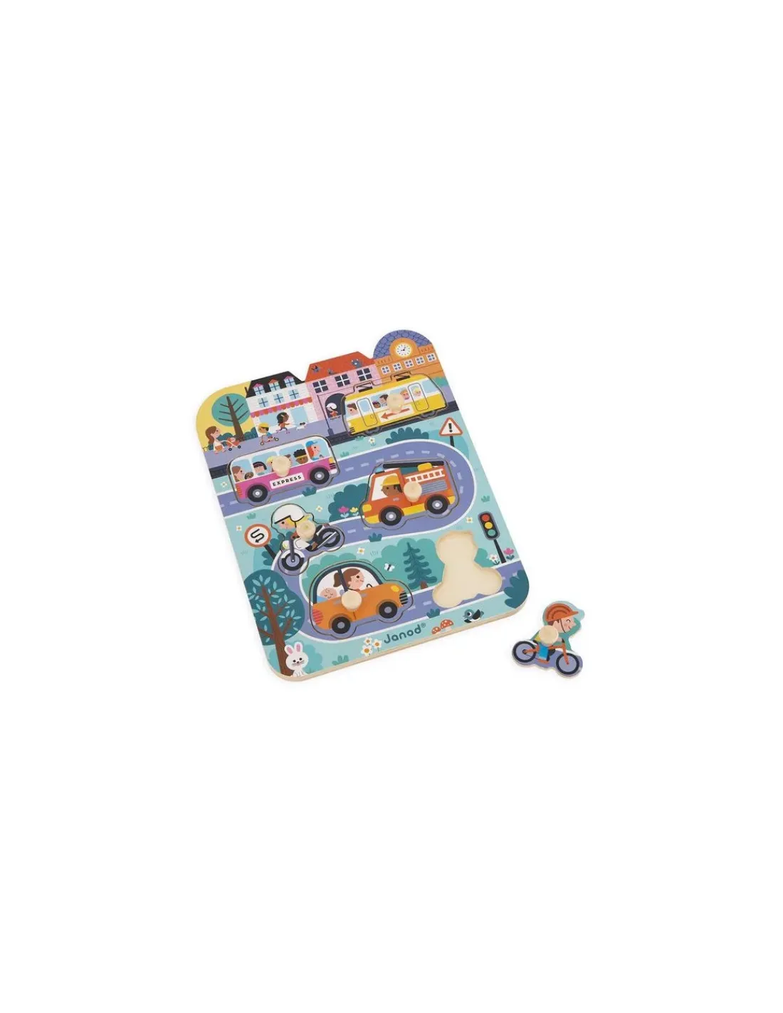 Découvrez le puzzle dans la ville de Janod, un puzzle d’encastrement en bois avec 6 pièces à tenons à replacer sur le thème de la ville et des véhicules.