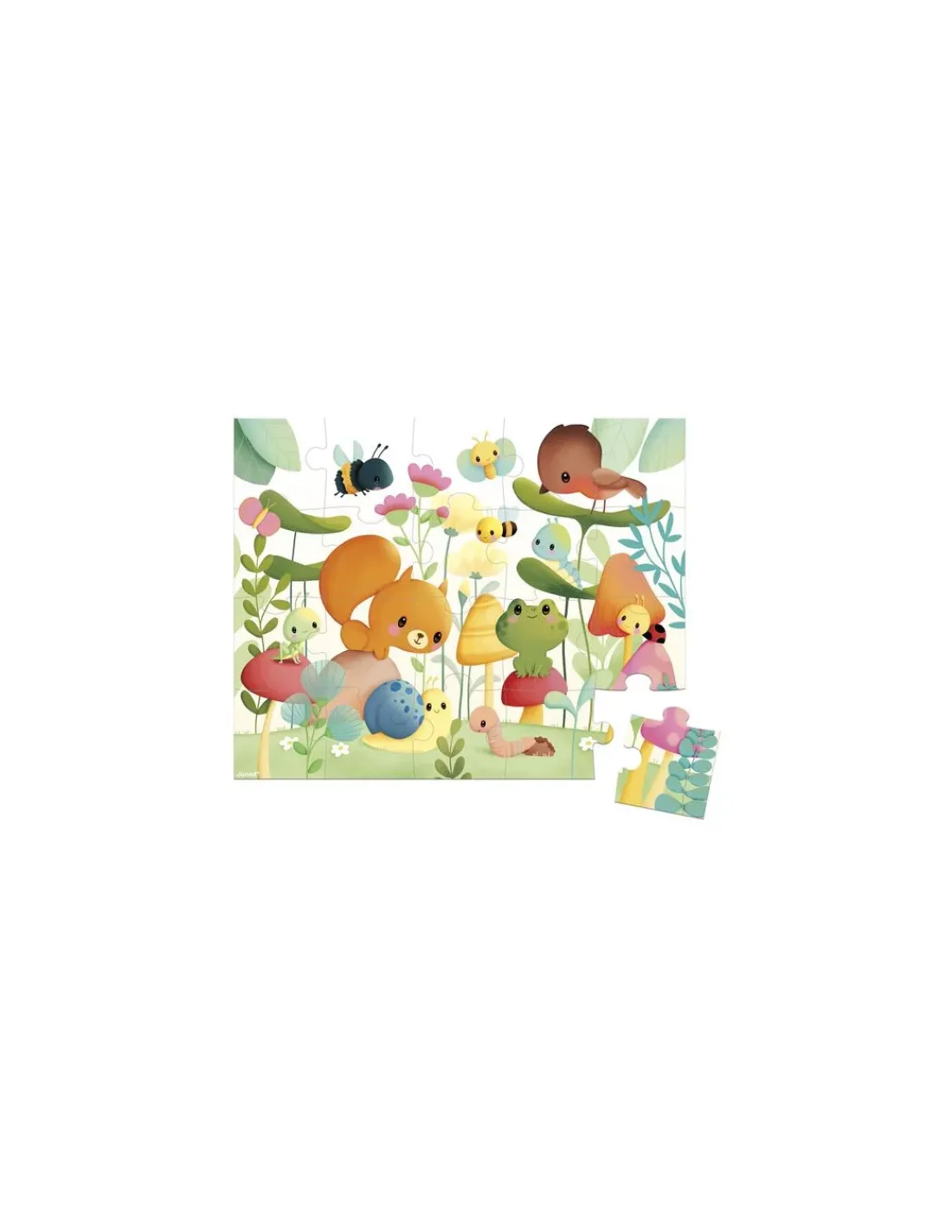 Après avoir assemblé les 20 pièces du puzzle, votre enfant découvrira de mignons petits animaux entourés de plantes et de fleurs : un écureuil, une coccinelle, un escargot, un oiseau, un papillon, une abeille…