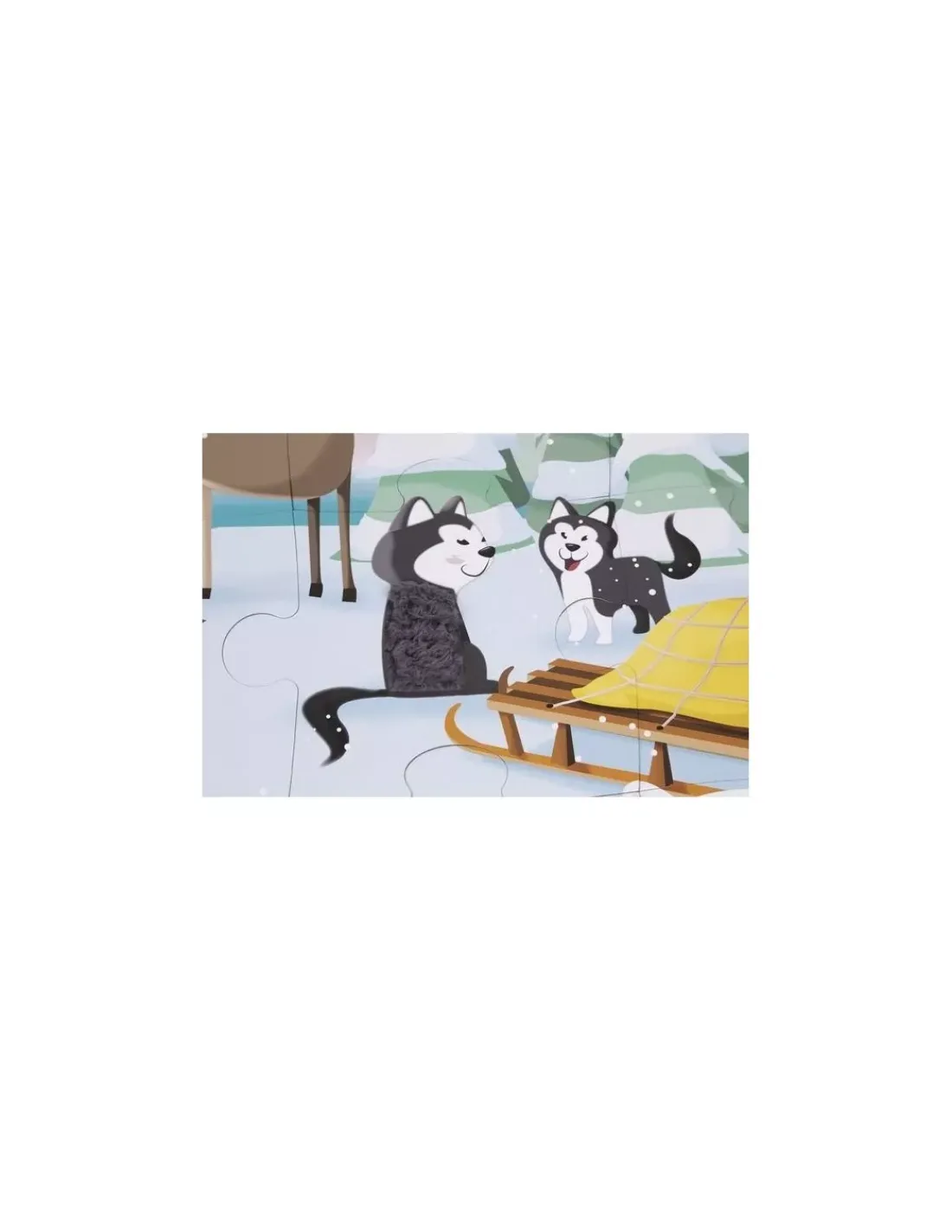 Découvrez le puzzle tactile la vie sur la banquise de Janod, un puzzle géant de 20 pièces en carton rigide avec 7 pièces tactiles pour éveiller les sens des enfants de 3 à 6 ans sur fond de banquise.
