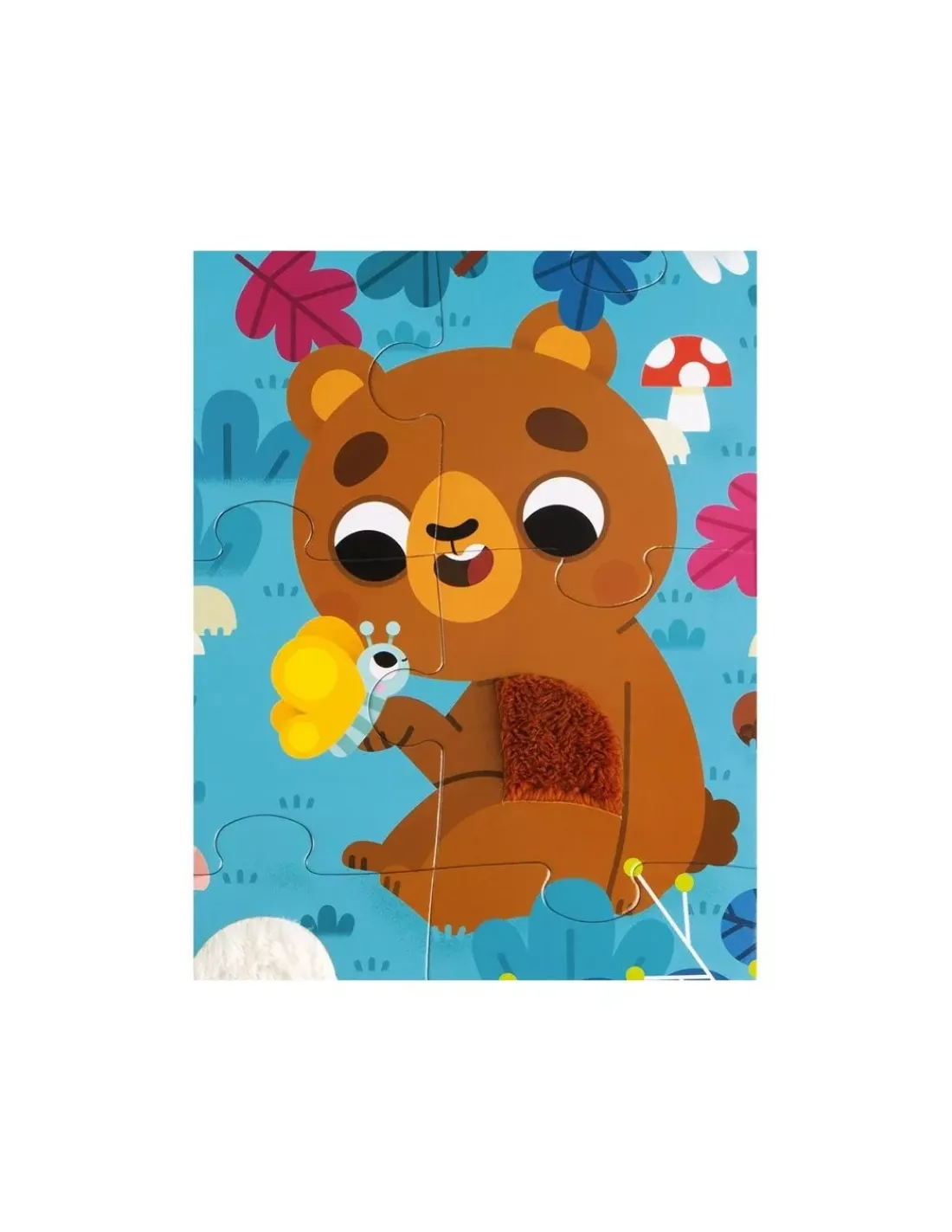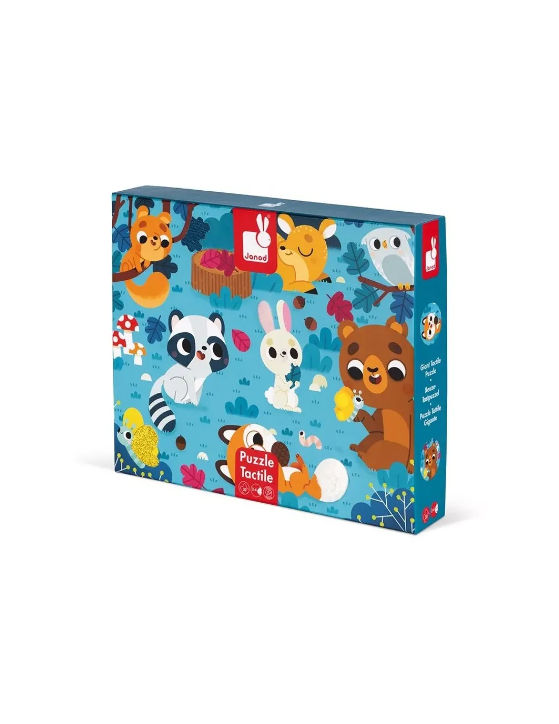 Découvrez le puzzle tactile les animaux de la forêt de Janod, un puzzle géant de 20 pièces en carton rigide avec 7 pièces tactiles pour éveiller les sens des enfants de 2 à 4 ans.