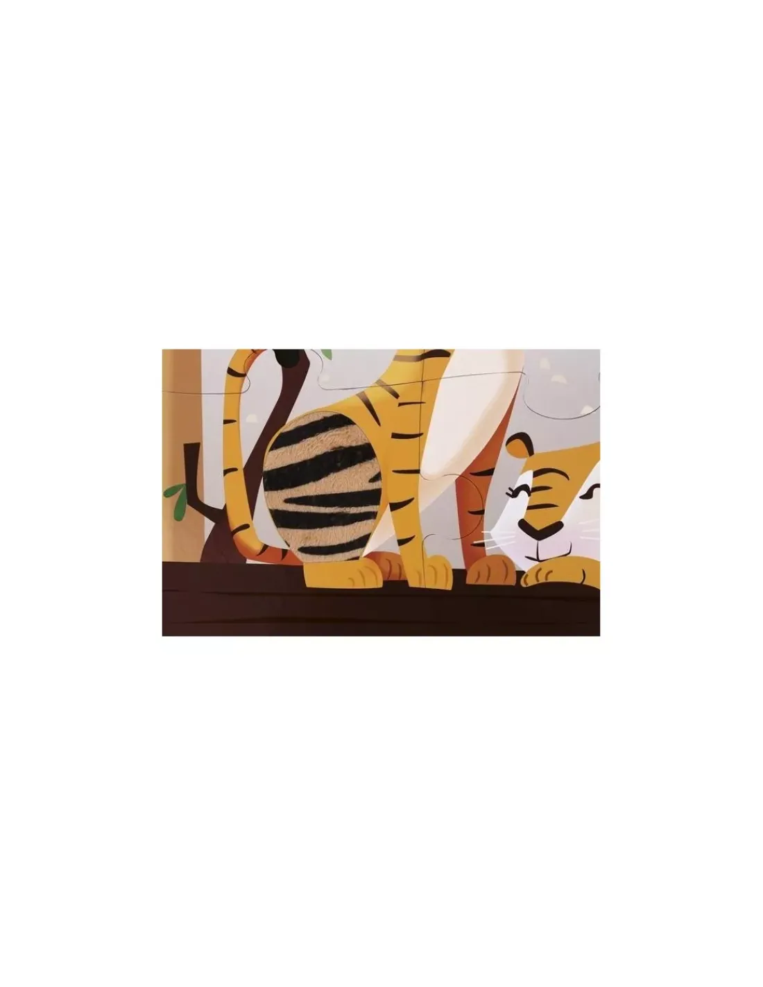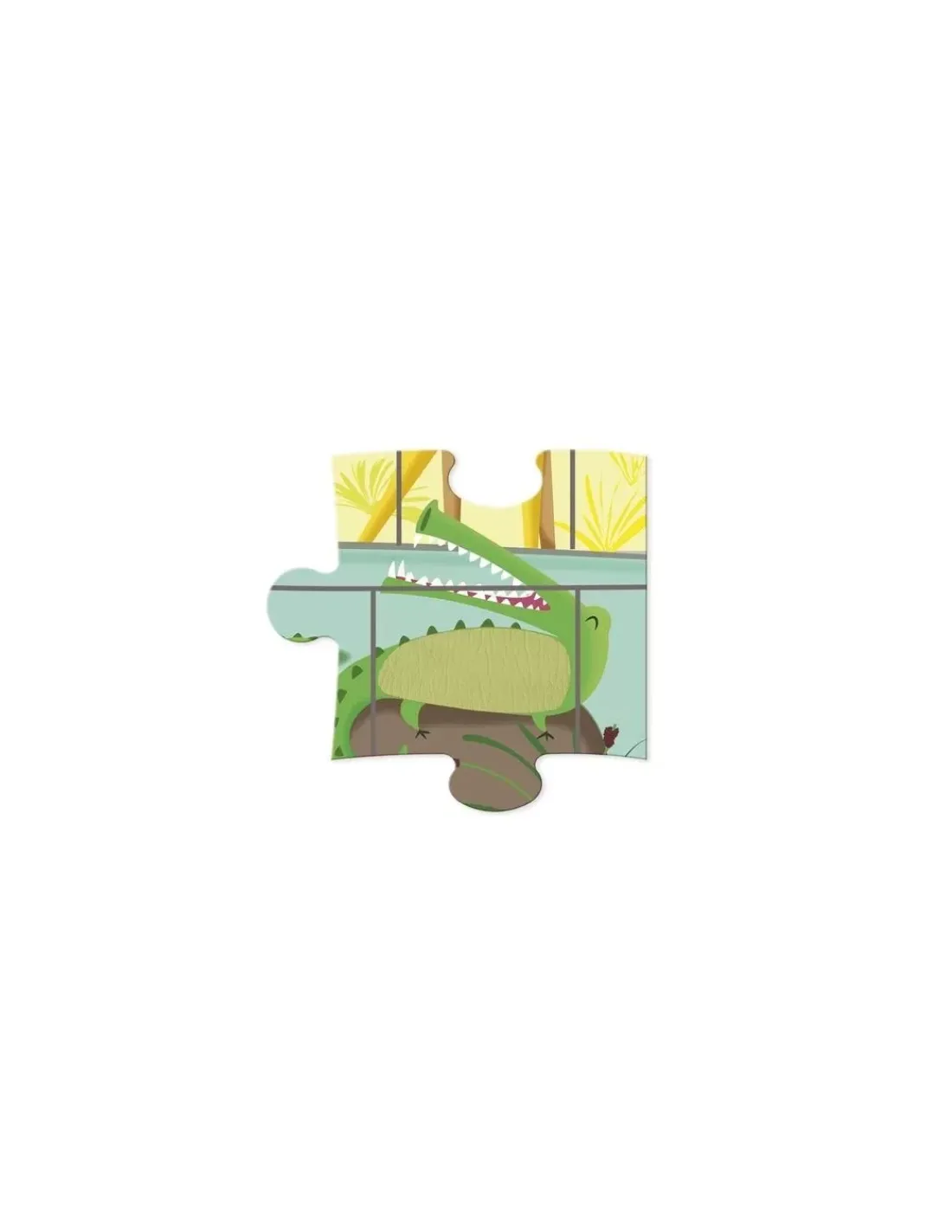 Découvrez le puzzle tactile une journée au zoo de Janod, un puzzle géant de 20 pièces en carton rigide avec 7 pièces tactiles pour éveiller les sens des enfants de 3 à 6 ans.