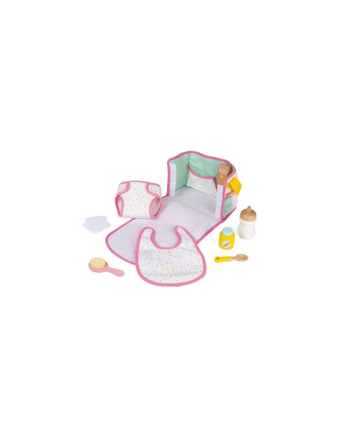 Le sac possède plusieurs poches et contient 8 accessoires : un bavoir, une couche, une cuillère, une brosse, un petit pot, un tube de crème, un biberon et deux cotons.