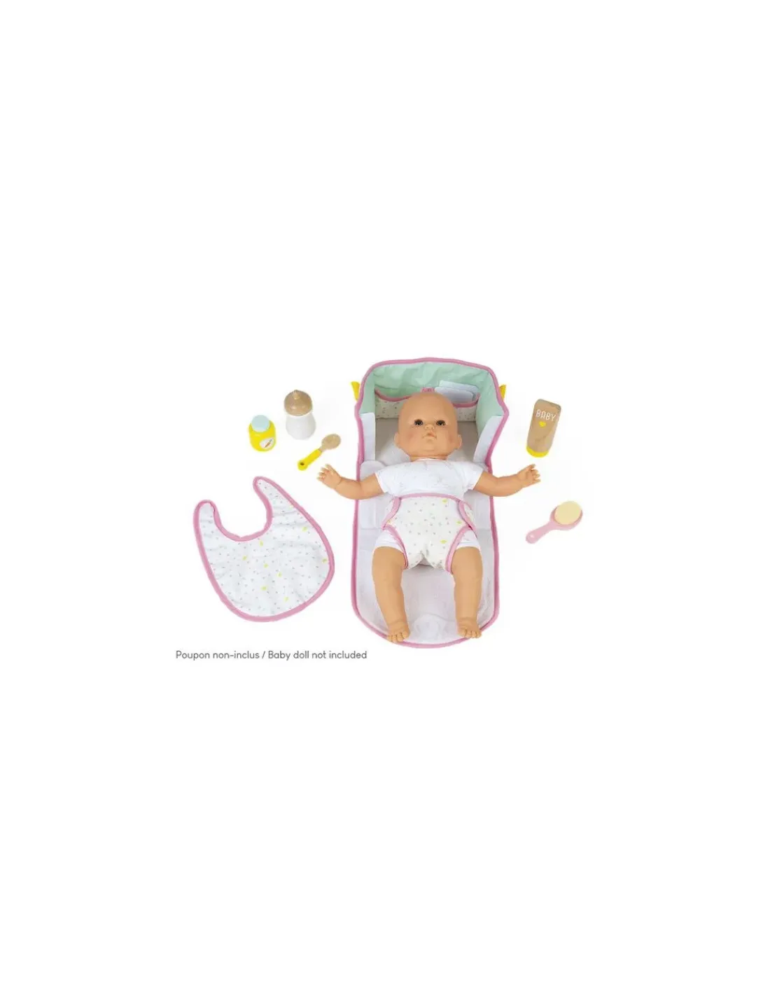 Découvrez le sac à langer Nursery de Janod, un sac qui se transforme en table à langer et qui comprend tous les accessoires nécessaires pour prendre soin de sa poupée dès 2 ans.