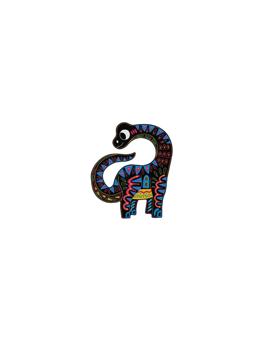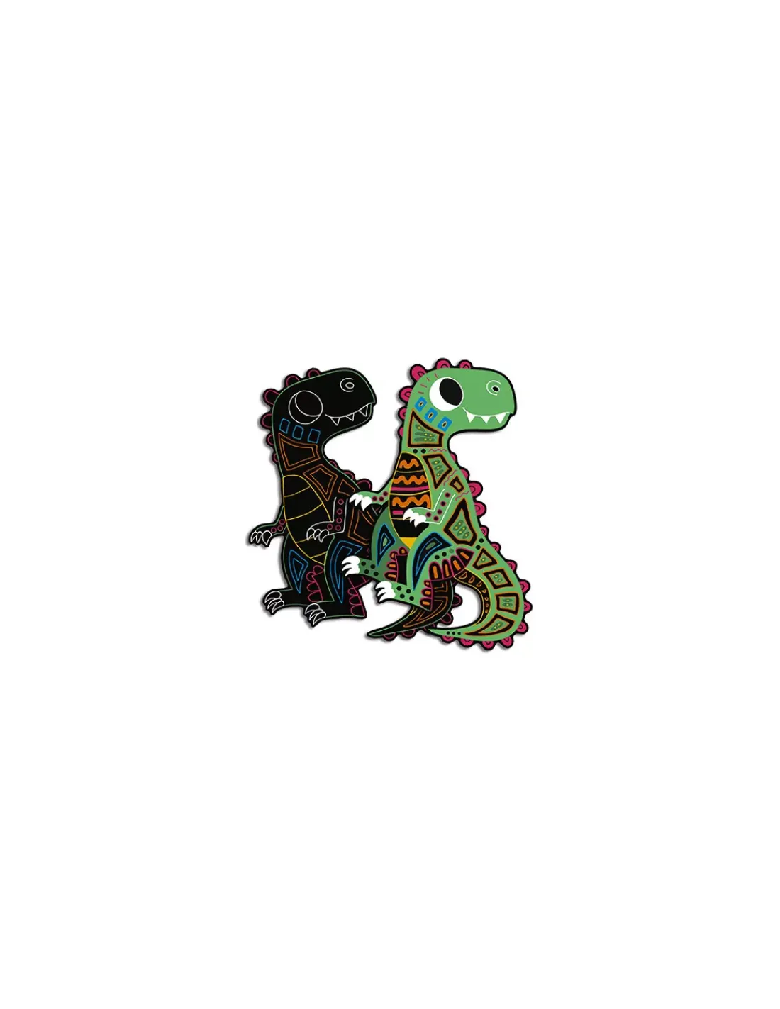 Un coffret contenant 5 dinosaures silhouettés à gratter (2 noirs, 1 vert, 2 violets avec des effets en couleurs et en dorure), un stylet en bois et 1 livret avec les modèles et les instructions.