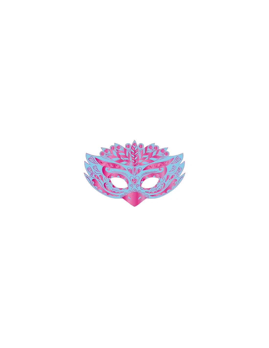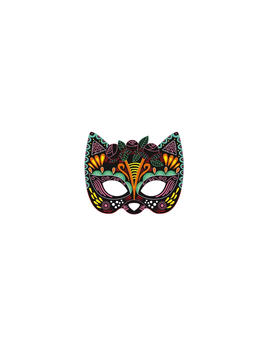 Un coffret contenant 5 masques découpés à gratter (3 noirs, 1 bleu, 1 violet avec des effets en couleur et en dorure), 5 élastiques argentés, un stylet en bois et 1 livret avec les modèles et les instructions.