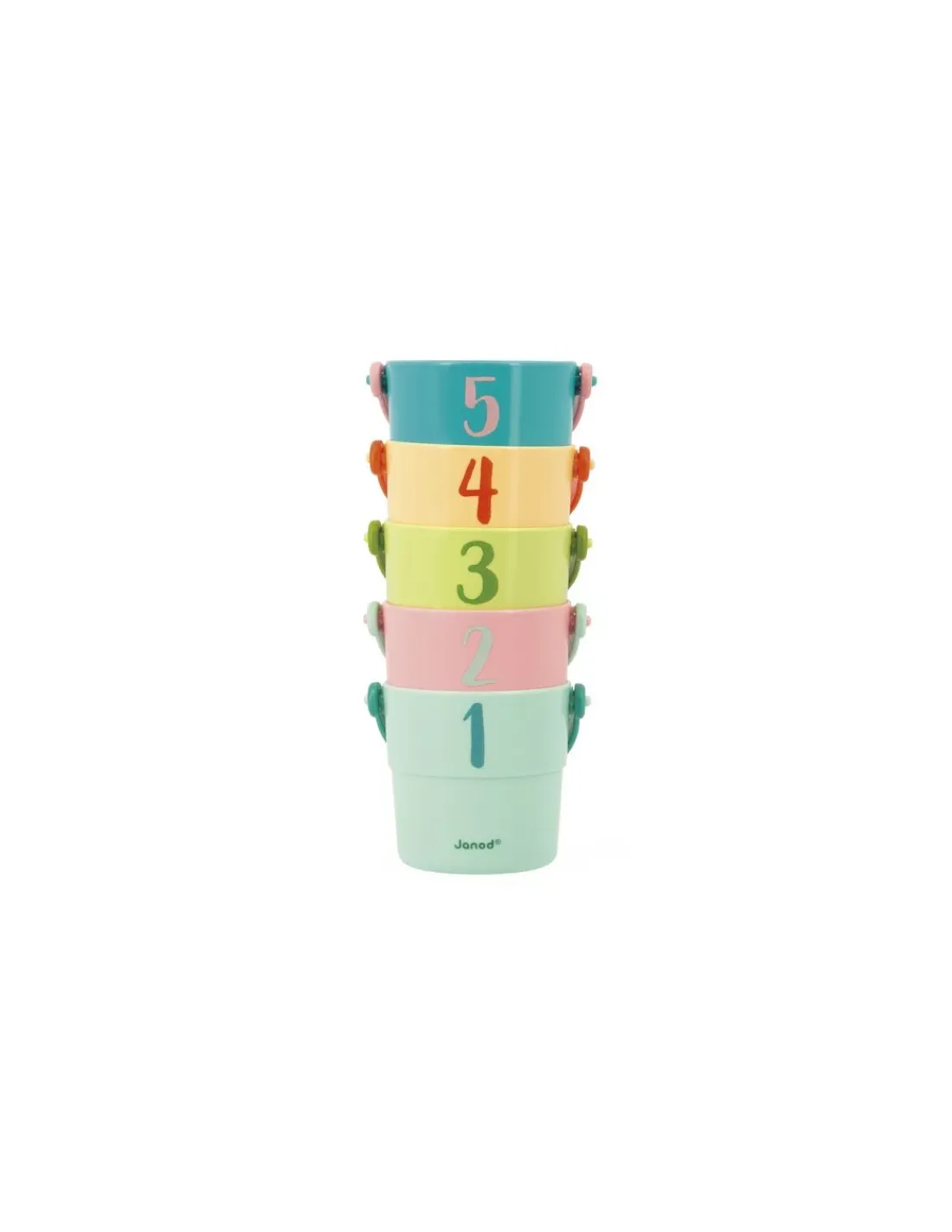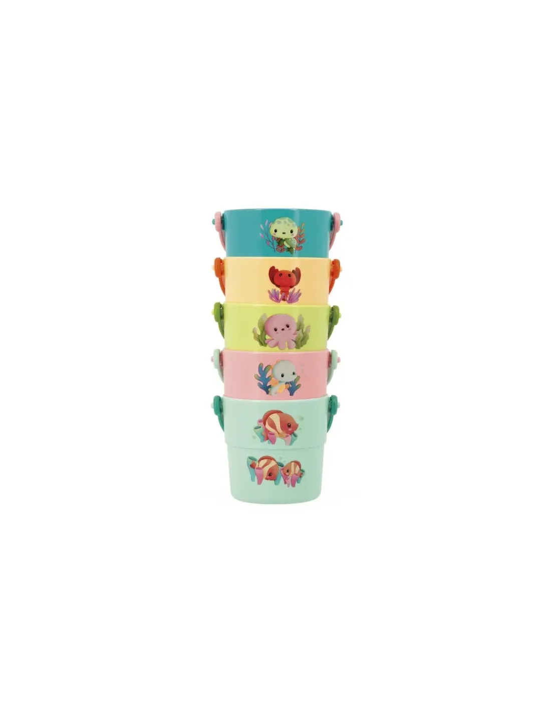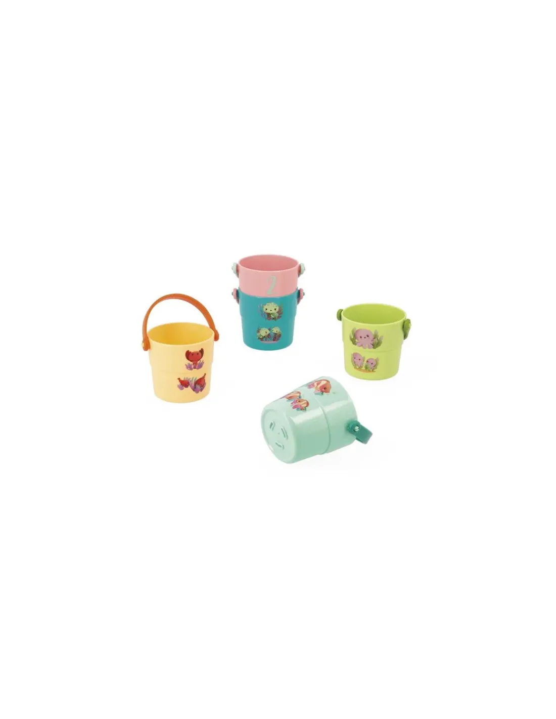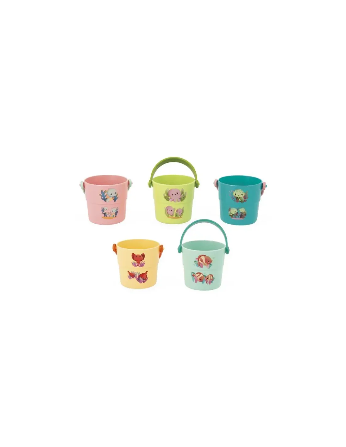 Découvrez le coffret Seaux Mes bébés animaux de Janod, un jouet de bain composé de 5 seaux colorés et illustrés pour amuser votre enfant dans le bain dès 10 mois.