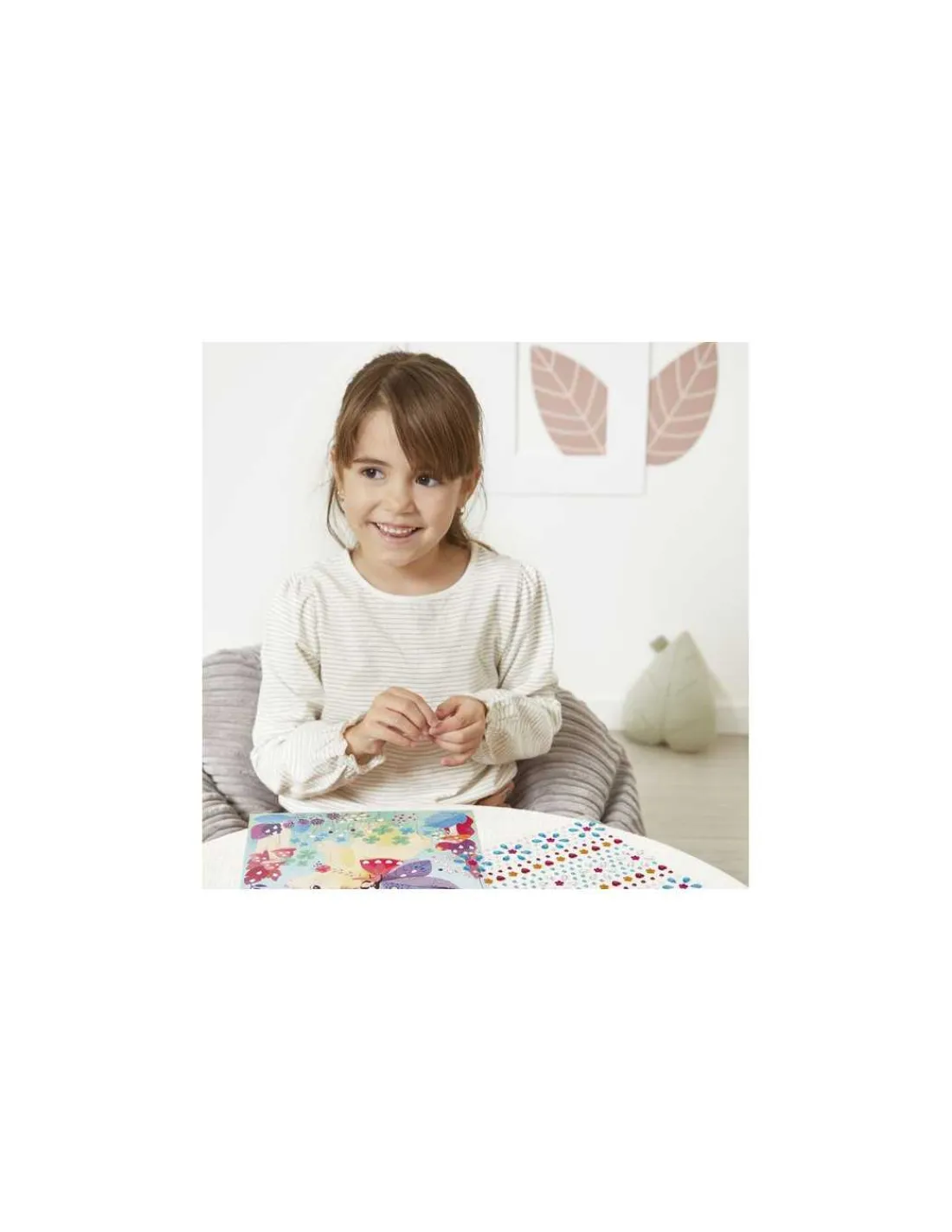 Un coffret contenant 3 tableaux illustrés de champignons, de papillons et d’animaux de la forêt, 1 grande planche avec 300 strass (4 formes et 4 couleurs différentes).