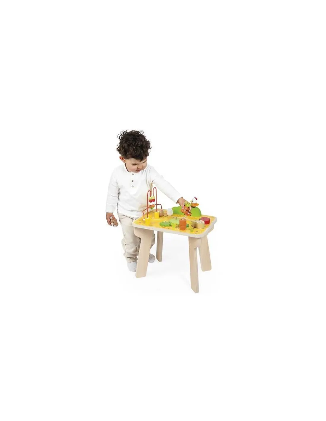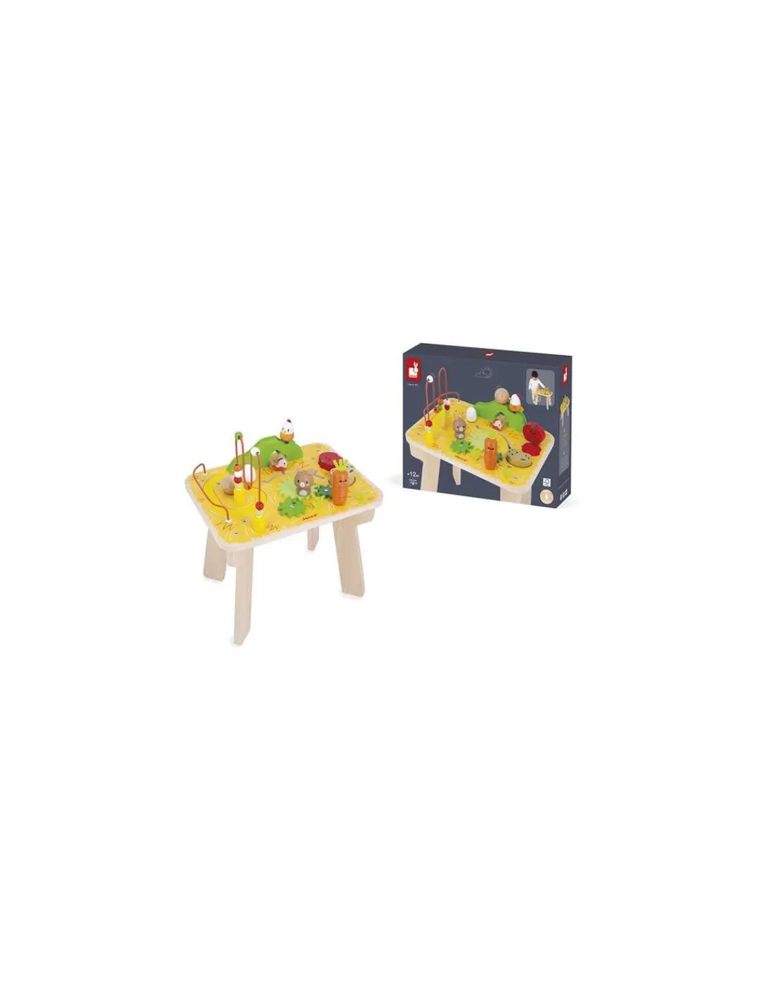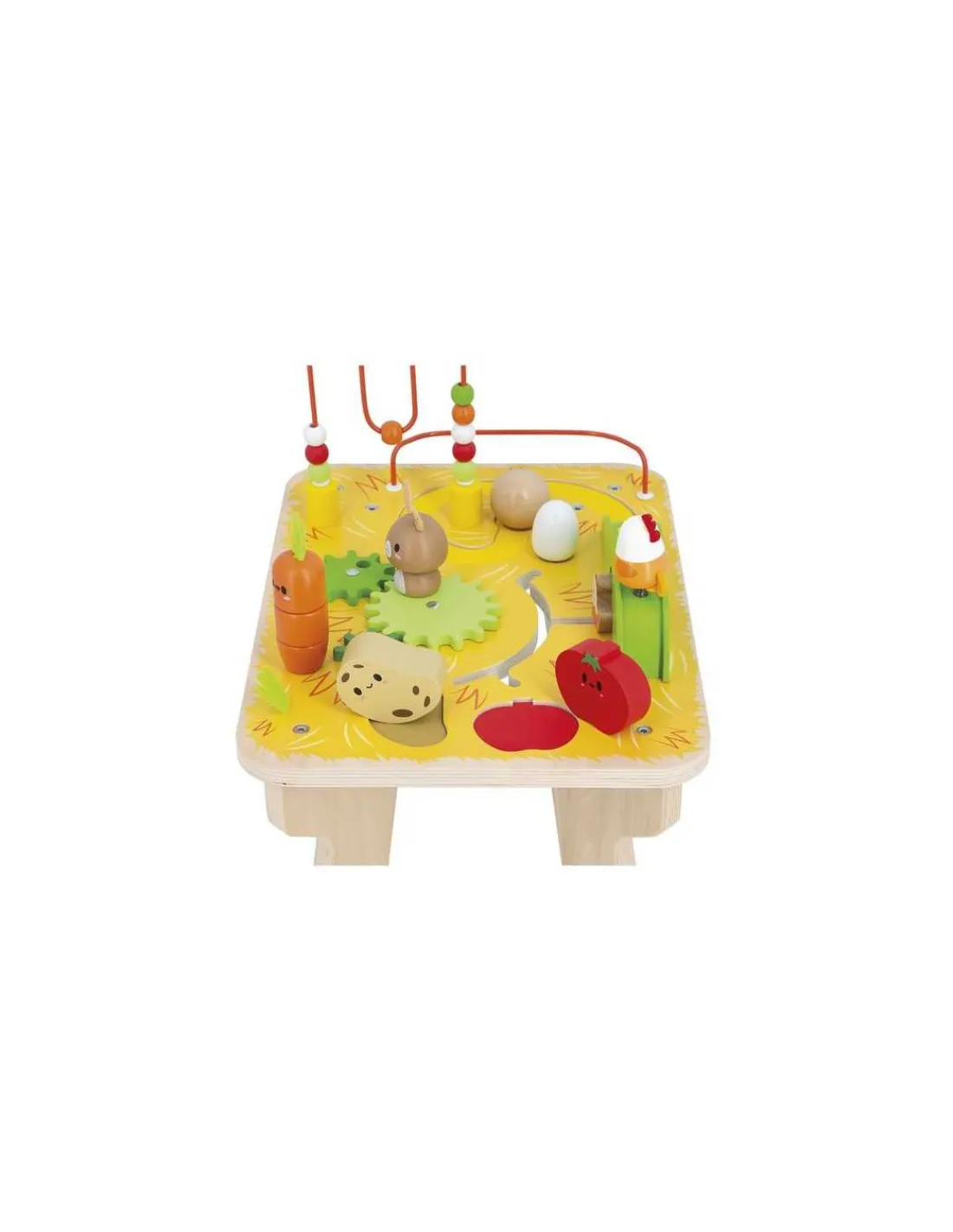 Cette table propose 7 activités ludiques pour stimuler la motricité fine, la concentration et la coordination : un circuit avec une boule en bois, poussée par une poule montée sur ressort, qui dévale un monticule, un looping avec 9 billes en bois, trois engrenages et un lapin amovible, un jeu d’empilage en forme de carotte, une pomme de terre et une tomate à encastrer, un labyrinthe avec une petite poule qui vient se cacher sous le monticule et un œuf rotatif sonore.