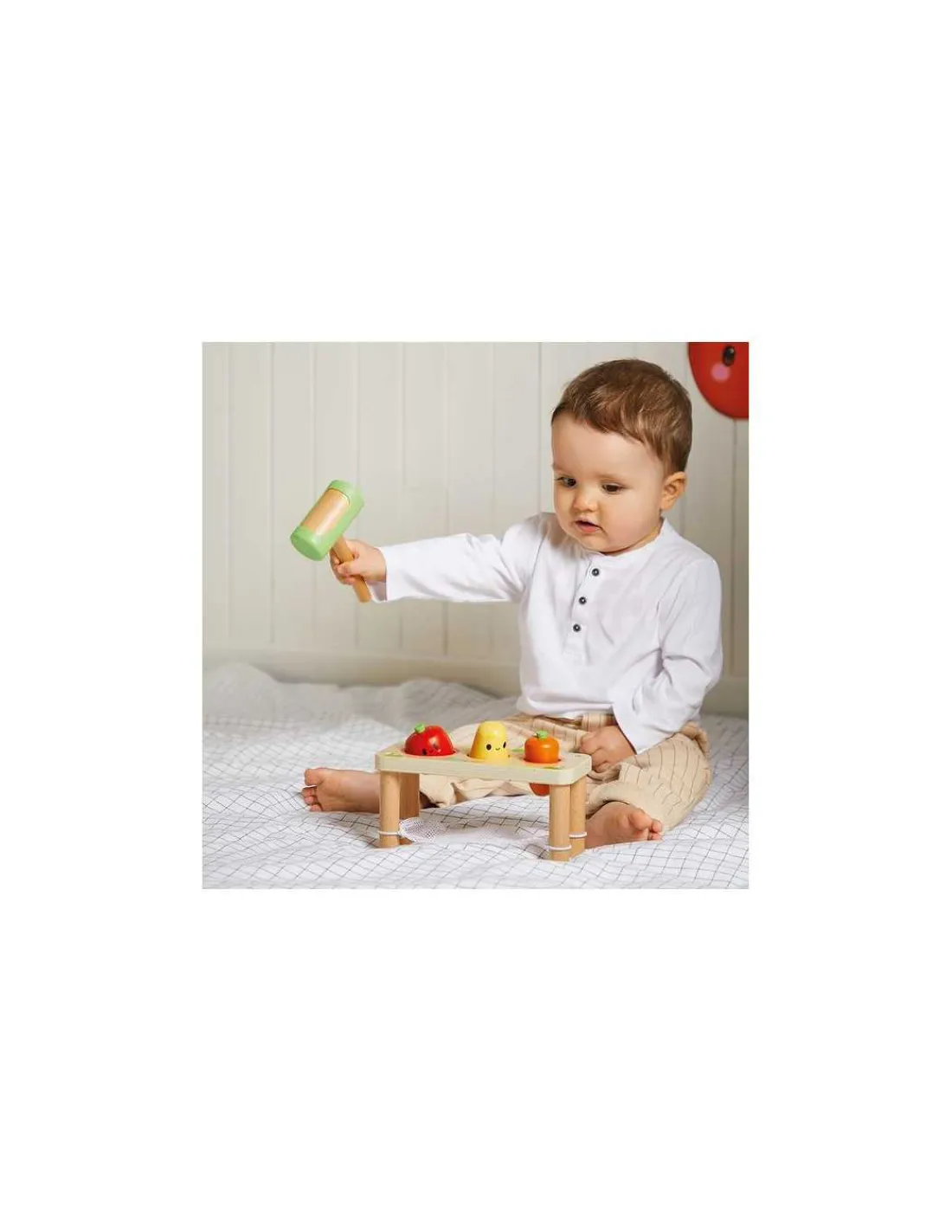 À l’aide du marteau équipé d’une coque en silicone pour atténuer le bruit, l’enfant tape sur les légumes en bois (une tomate, une pomme de terre et une carotte) pour les faire tomber dans le filet. Les freins en silicone placés dans les trous ajoutent une dimension supplémentaire au défi, encourageant ainsi les enfants à affiner leur précision et leur coordination.