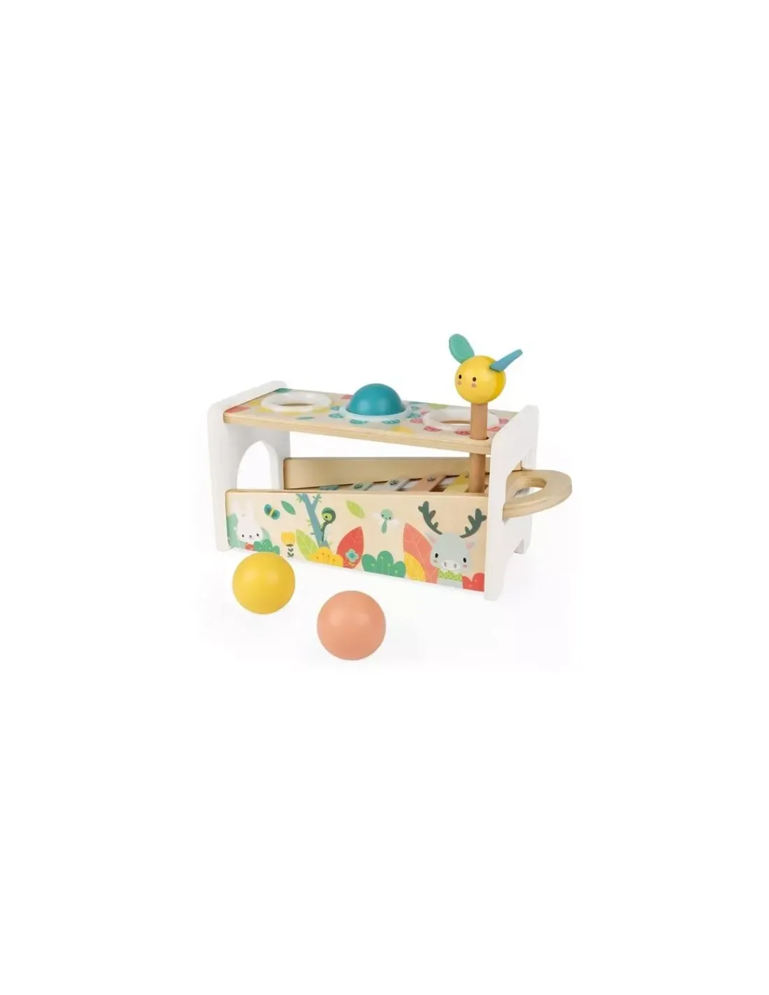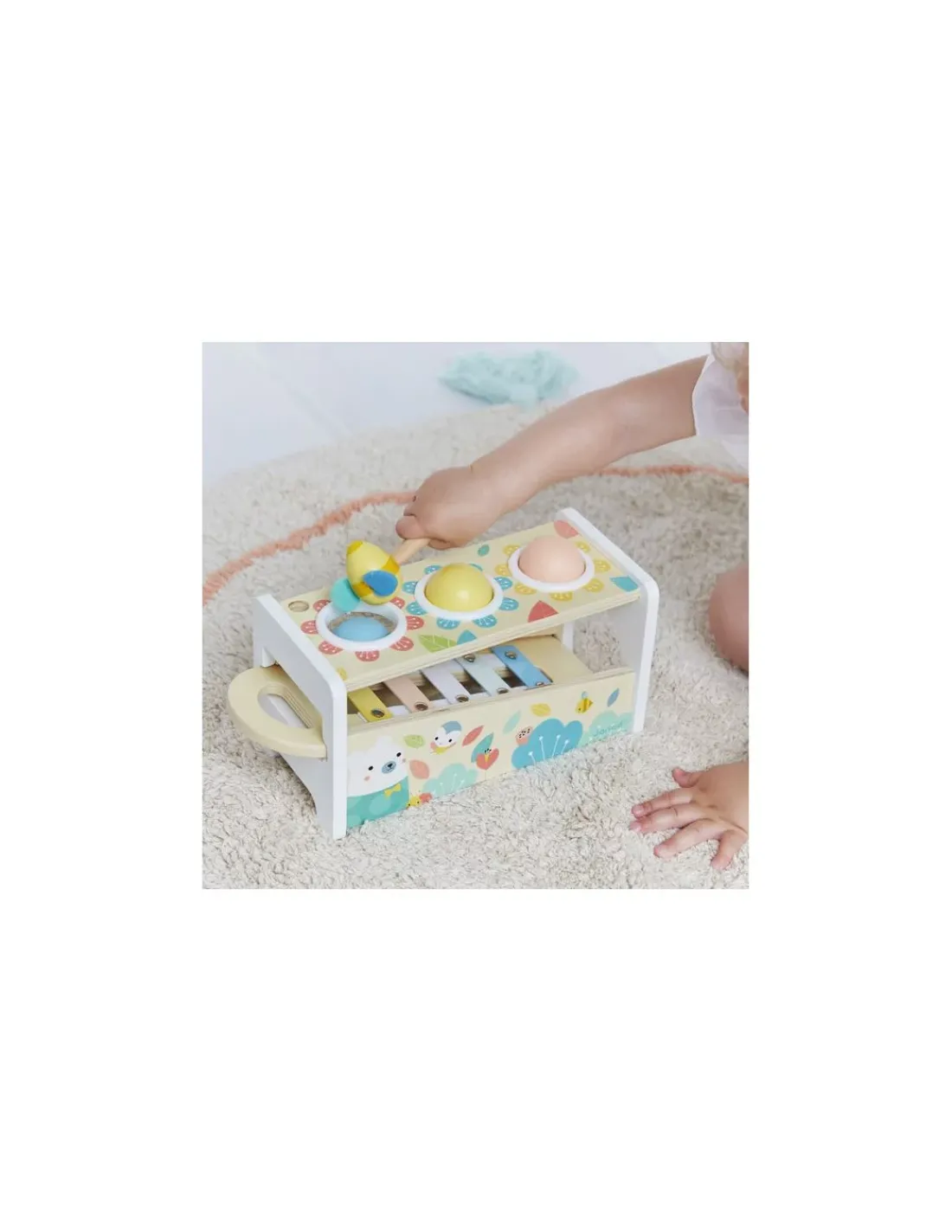 Un jouet 2 en 1 avec un xylophone amovible pour faire de la musique et un jeu à taper avec 3 boules à frapper avec le maillet.