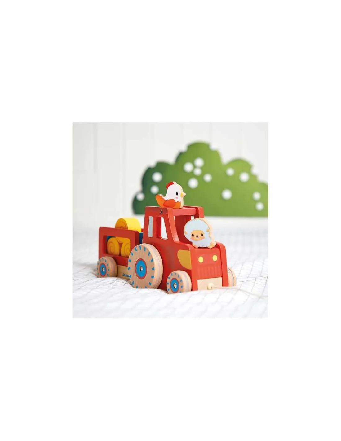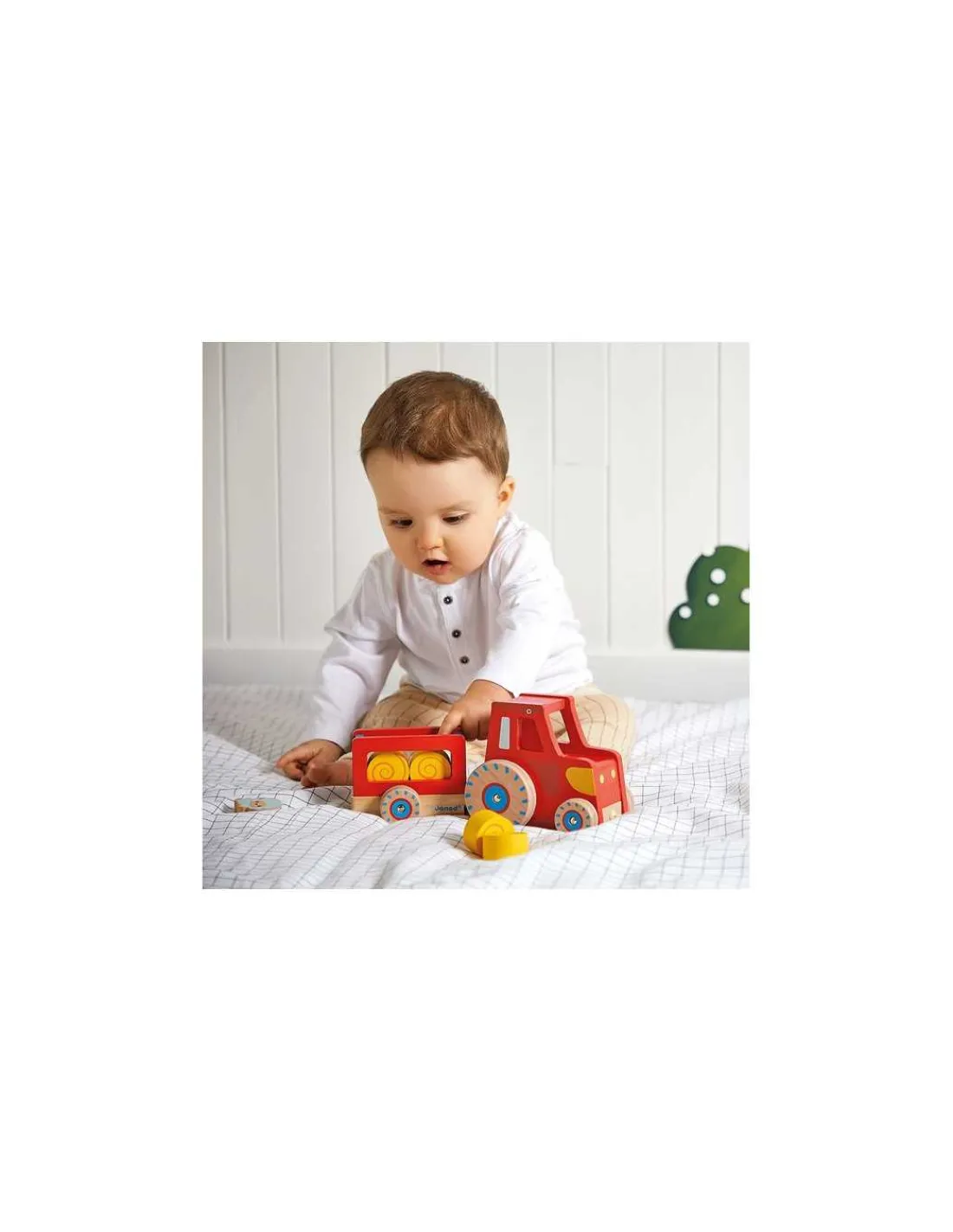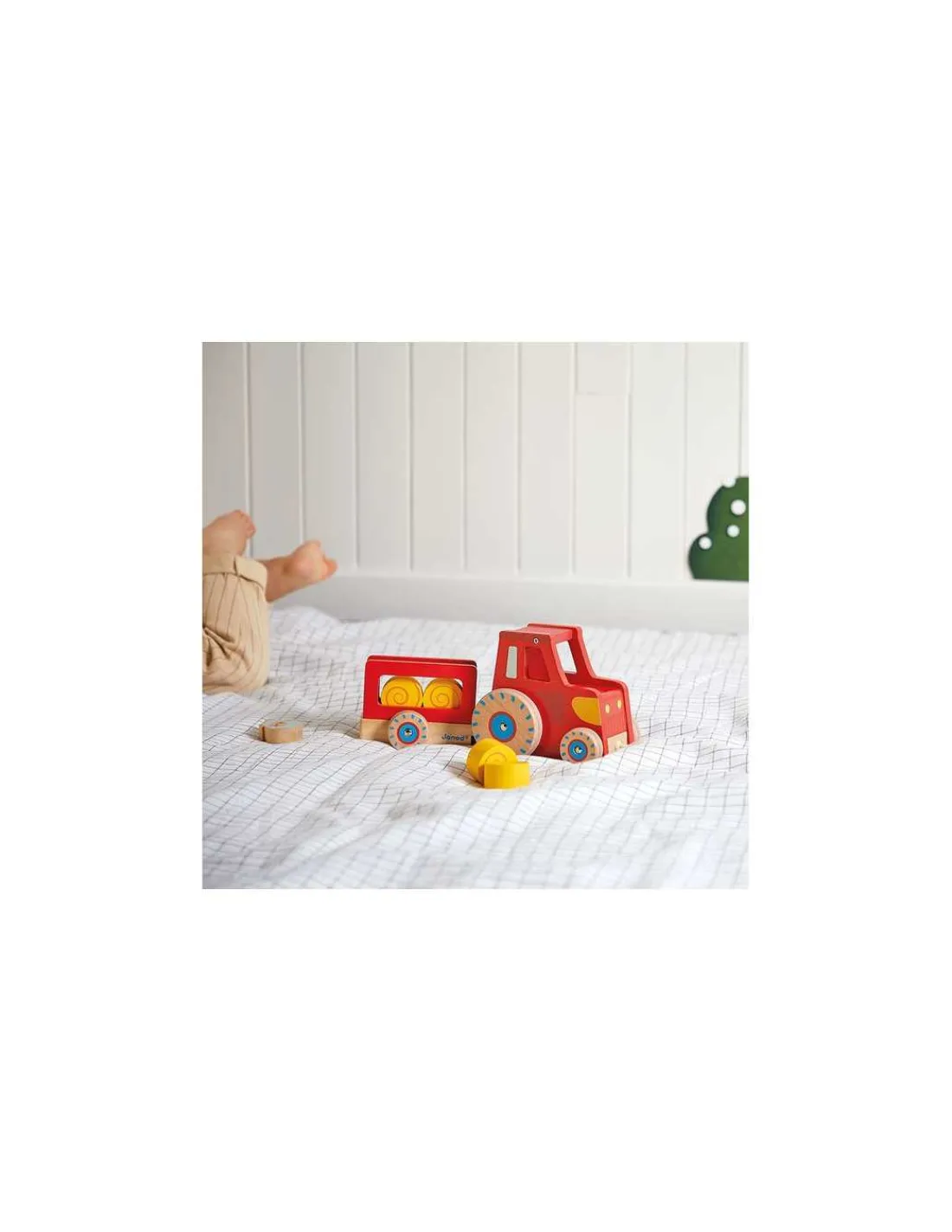 Ce joli tracteur rouge est accompagné de sa remorque amovible, grâce à laquelle votre enfant pourra transporter les ballots de paille ou les animaux en bois. Grâce à ses roues silencieuses en silicone, votre enfant pourra promener son tracteur dans toute la maison en toute tranquillité.