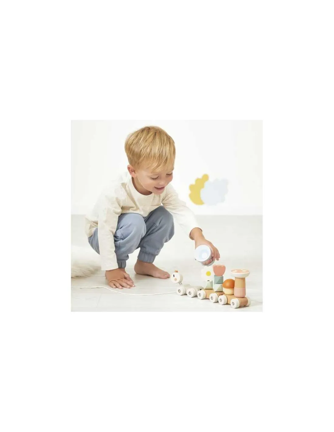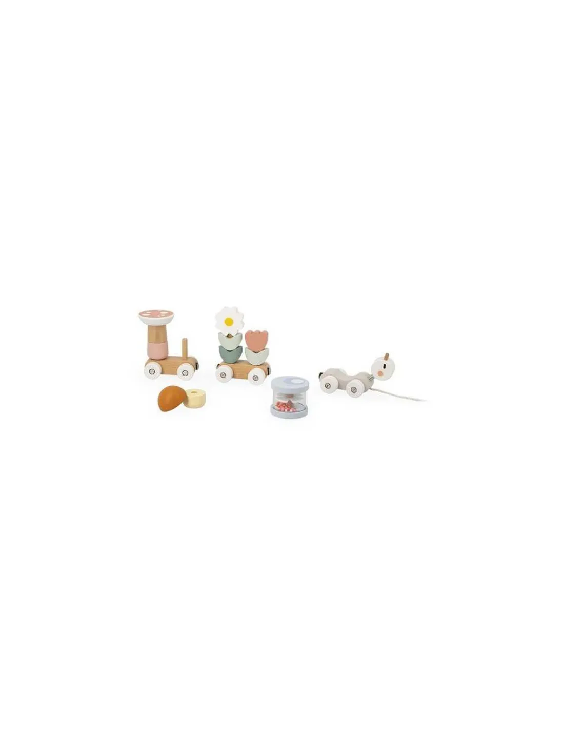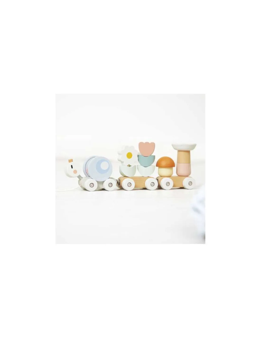 Un jouet à promener aux couleurs douces qui va faire le tour de la maison. Un superbe jeu de construction composé de 3 wagons amovibles et de 10 pièces pour éveiller les enfants dès 1 an.