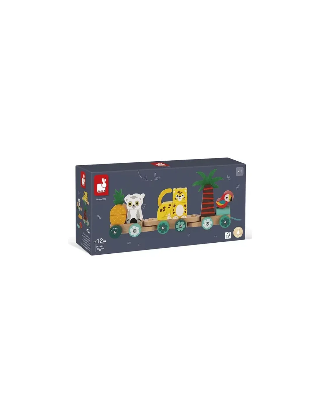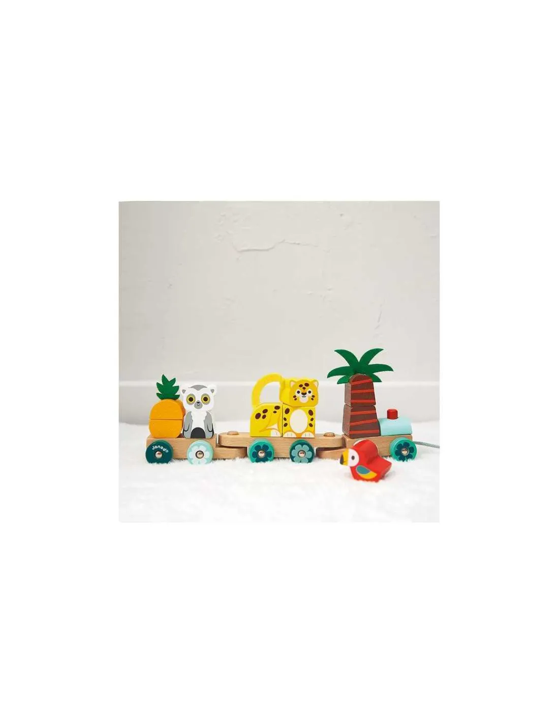Découvrez le train tropical à tirer de Janod, un jouet en bois 2 en 1 de la collection Tropik comprenant un jouet à tirer et un jeu à encastrer pour amuser les bébés dès 12 mois.