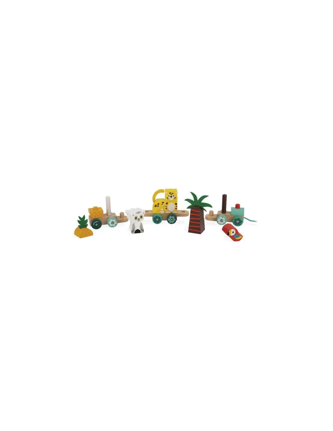 En jouant, votre enfant va développer sa motricité en assemblant les 3 wagons, puis en plaçant les blocs de construction colorés représentant un lémurien, un jaguar, un perroquet, un ananas et un palmier. Un train aux couleurs pétillantes et exotiques qui va faire le tour de la maison.