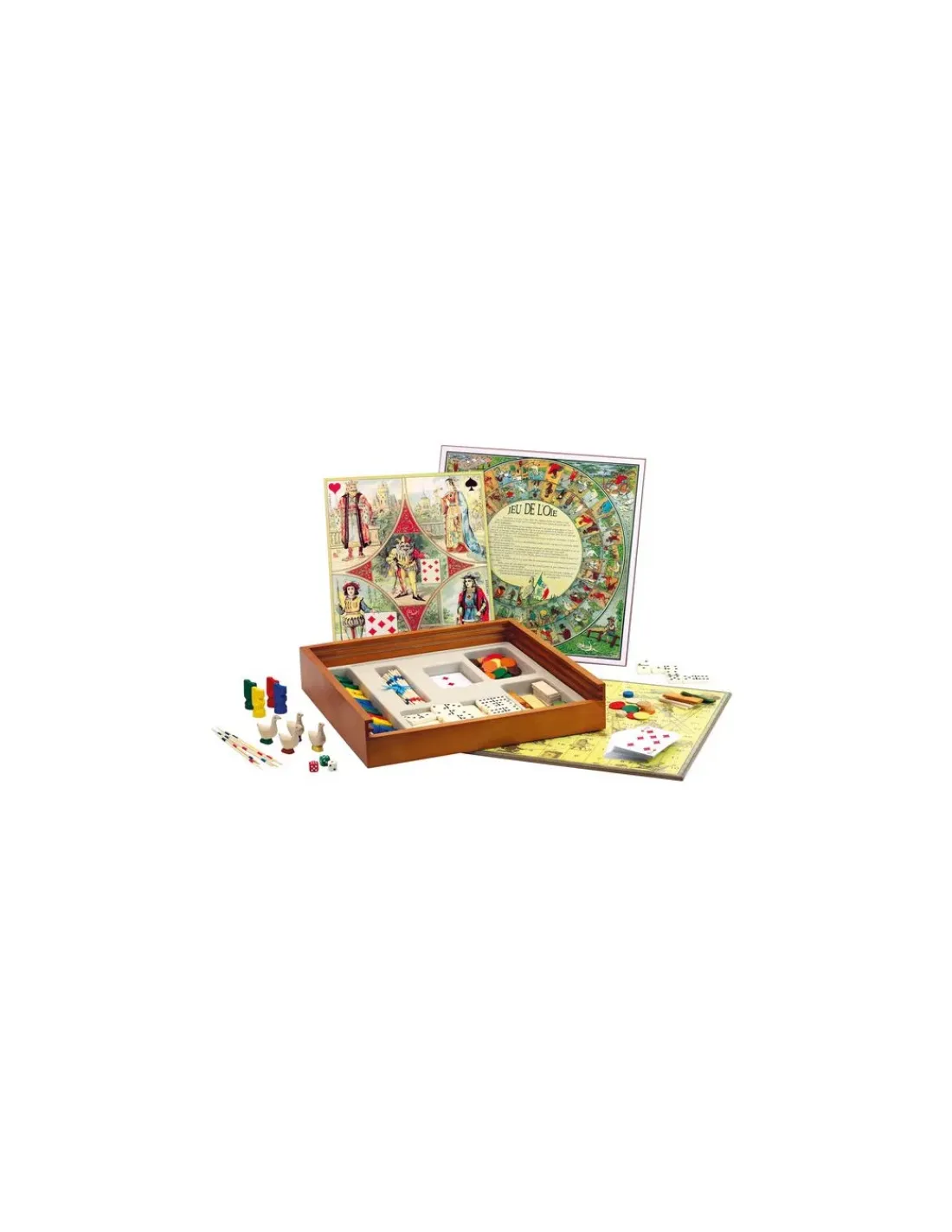 Les enfants et les adultes redécouvriront les jeux de sociétés de leur enfance, le classique jeu des petits chevaux, le jeu de l’oie, le jeu du moulin, le jeu des échelles, le nain jaune, le mikado, les dominos et un jeu de 54 cartes. Traditionnel et illustré à l’ancienne, ce coffret en bois renferme tous les jeux classiques indispensables à avoir chez soi. La mallette de jeux à trouver dans toutes les maisons.