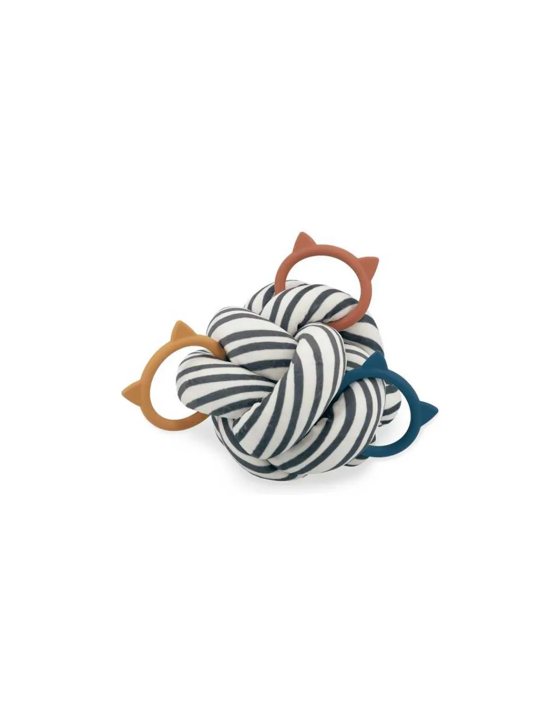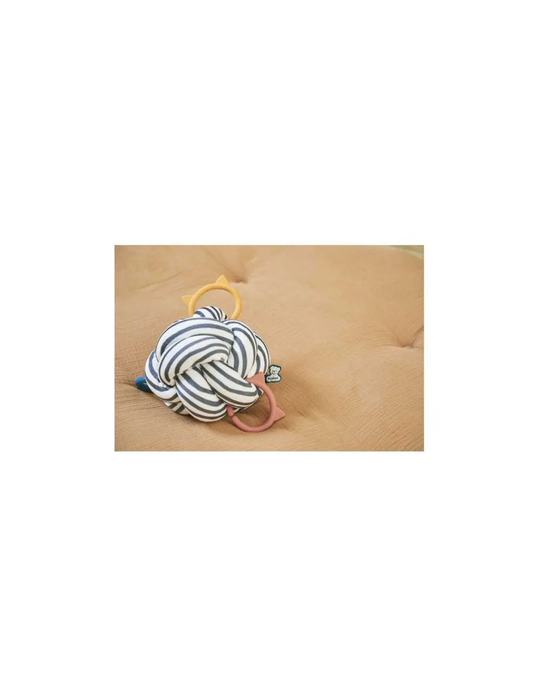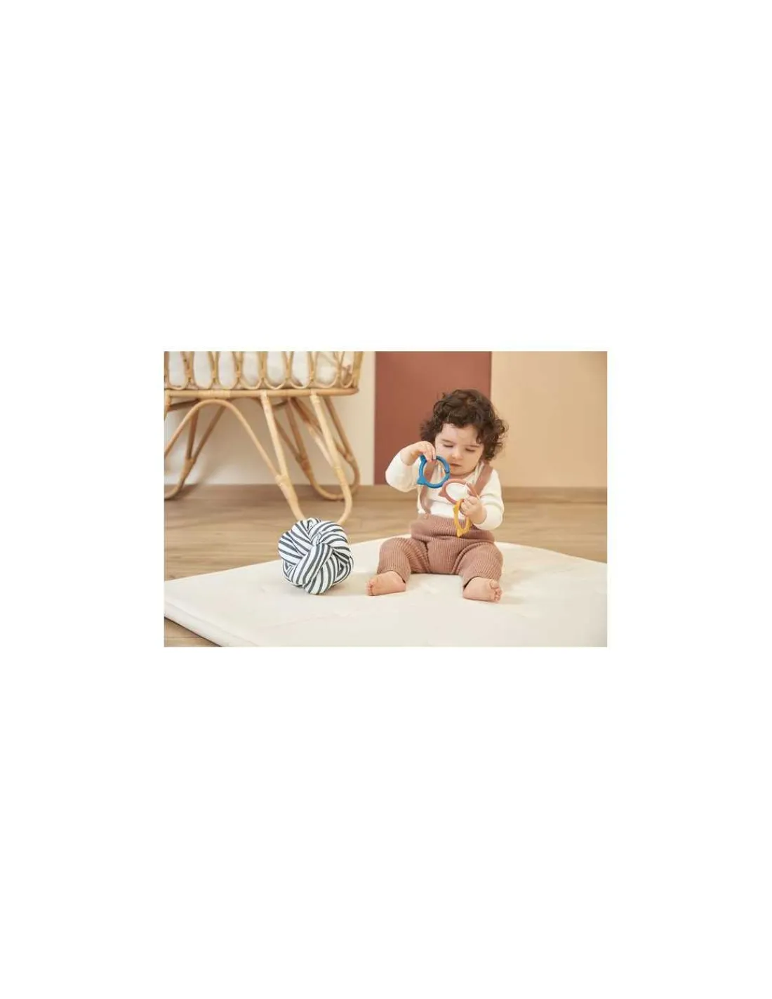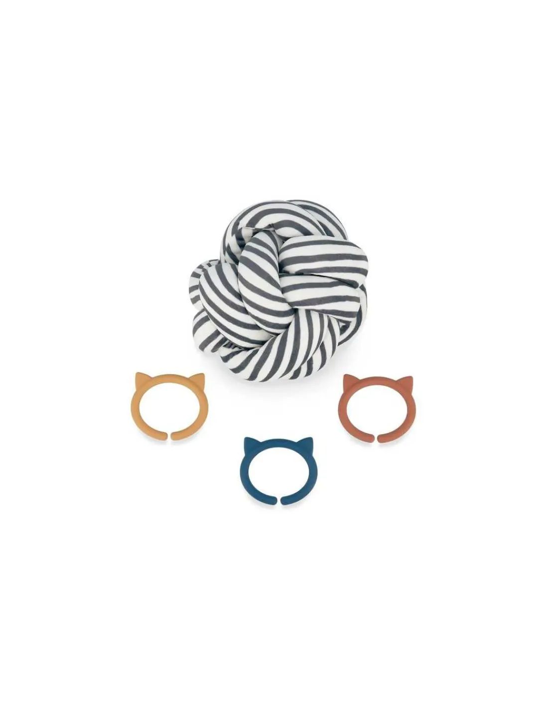 Les motifs contrastés de la balle stimulent la perception visuelle et encouragent le développement du toucher. Les bandes entrelacées sont spécialement conçues pour aider bébé à développer une bonne prise en main. La balle possède trois anneaux de dentition en silicone, en forme de chat, qui sont amovibles et peuvent être placés n’importe où sur la balle.
