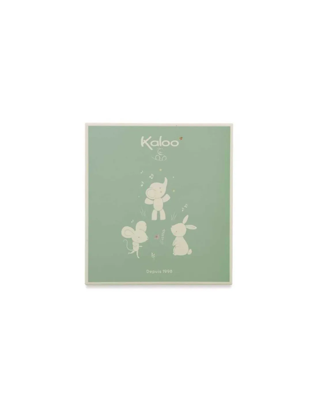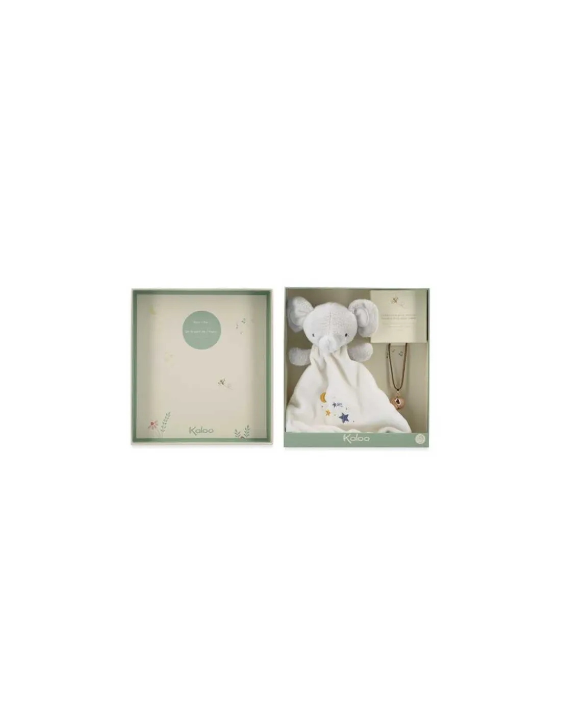Découvrez le Coffret Doudou Bola éléphant de la collection Petites chansons de Kaloo, un coffret de naissance à offrir dès la grossesse comprenant un doudou lapin et un collier bola.