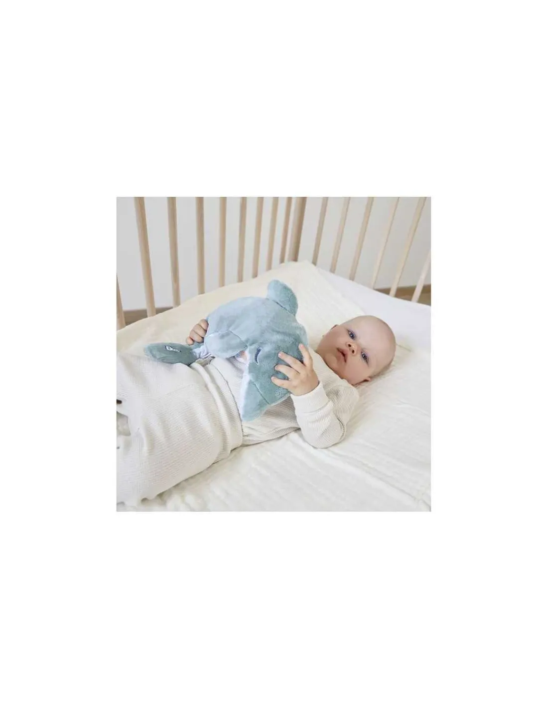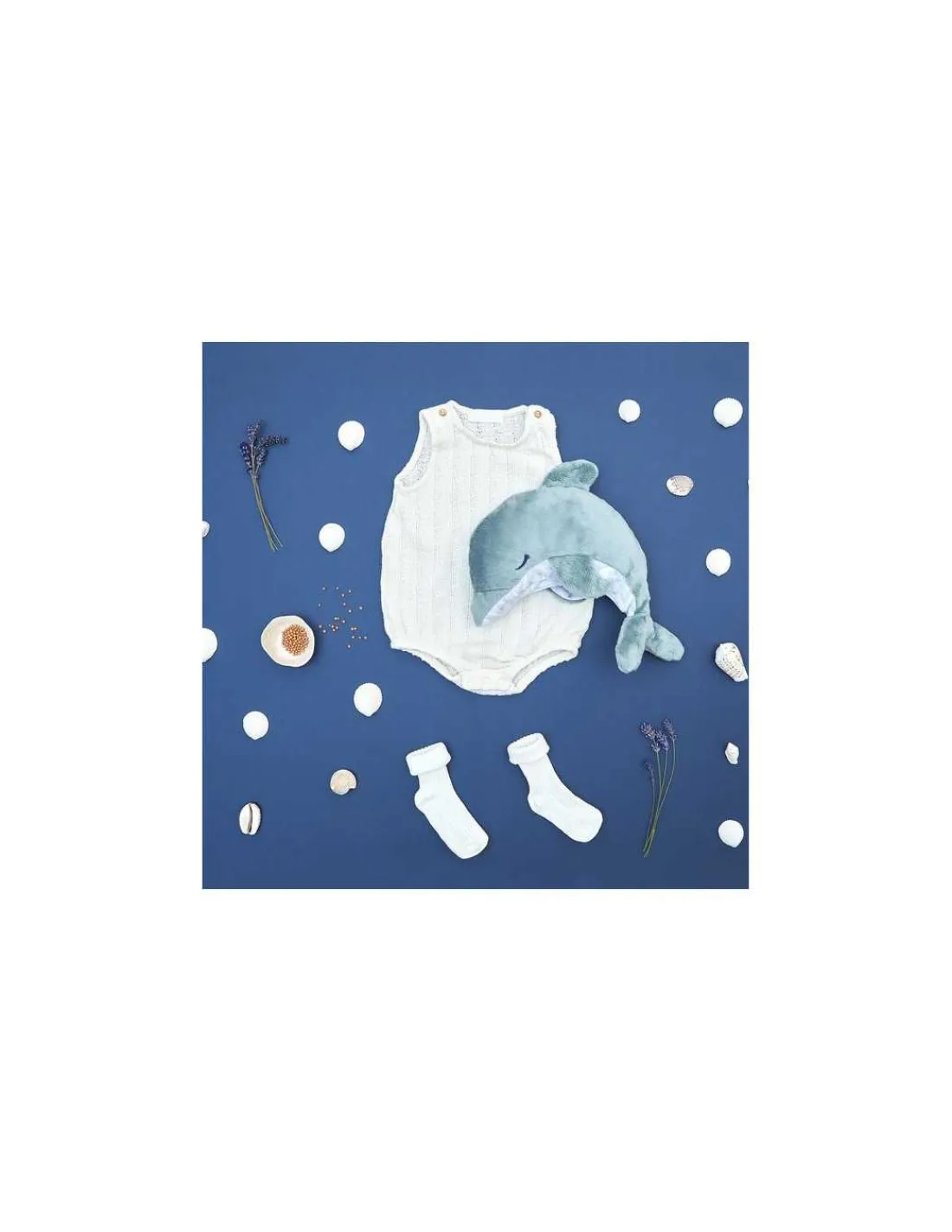 Un adorable dauphin adapté aux tout-petits avec un côté peluche et au verso des broderies de poisons et un bel imprimé « danse des vagues » qui renferme une poche amovible garnie de billes en argile et fleurs de lavande séchées.