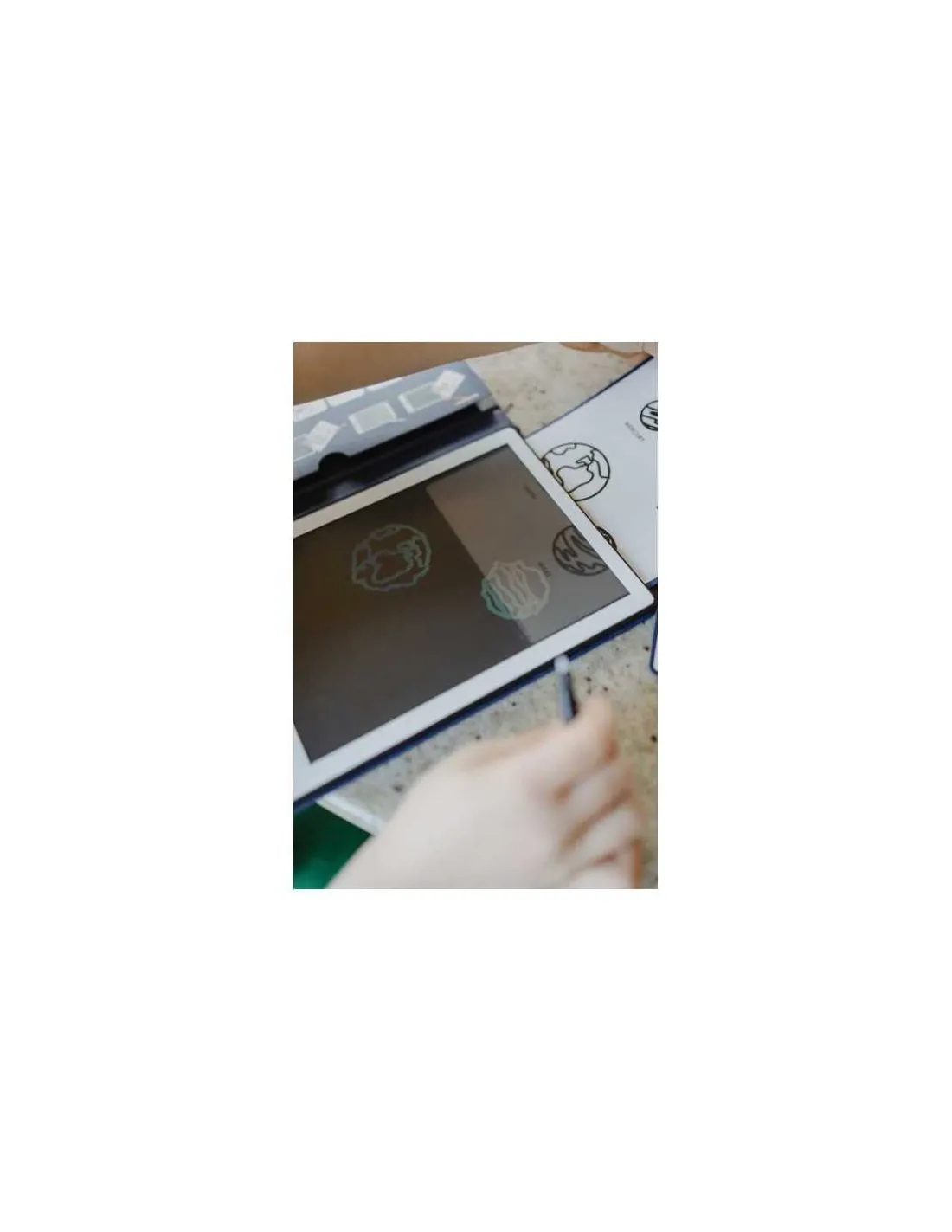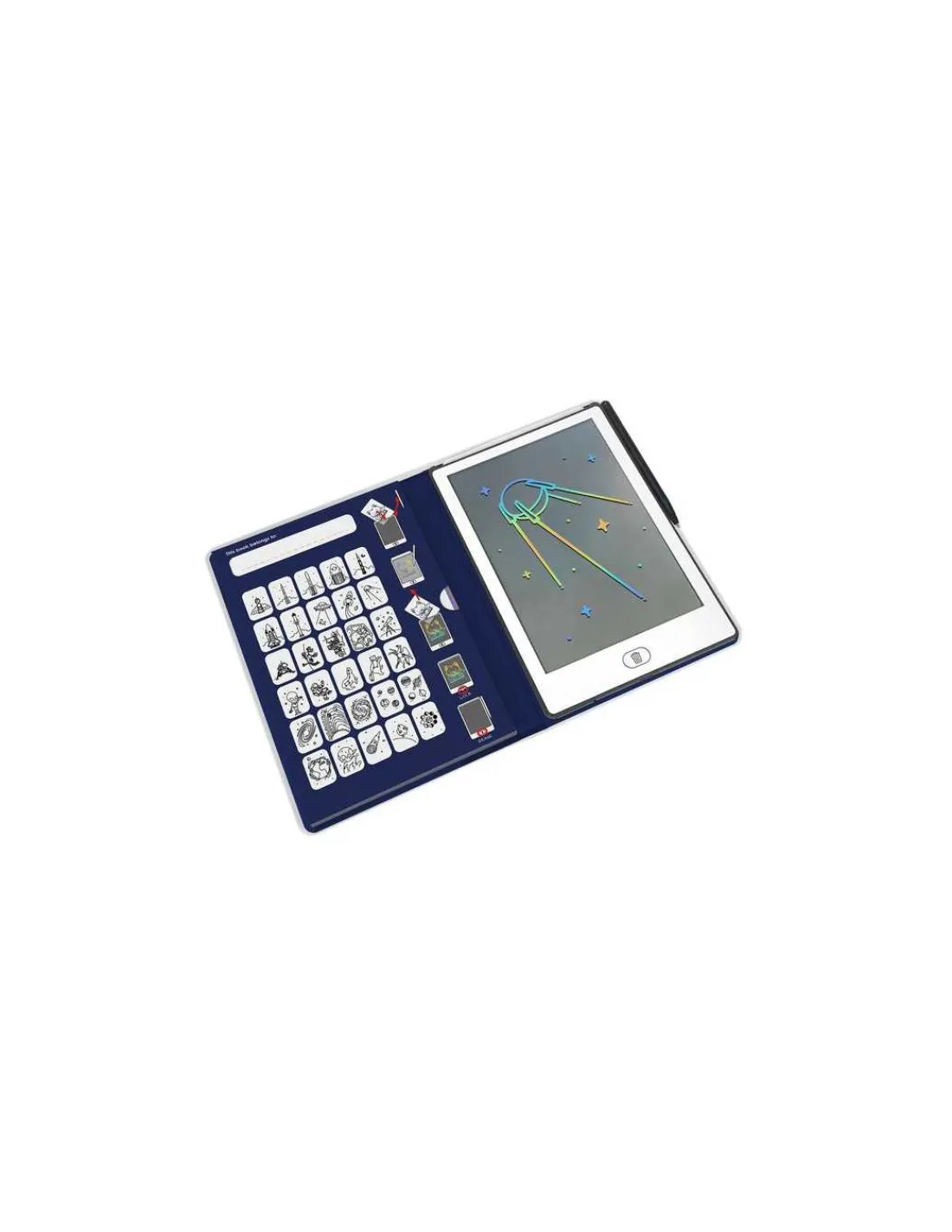 Le coffret comprend une tablette avec 30 dessins à décalquer avec un écran LCD de 8,2″ (Liquid Crystal Display), un bouton verrou pour sauver le dessin, un bouton pour effacer et un stylo.