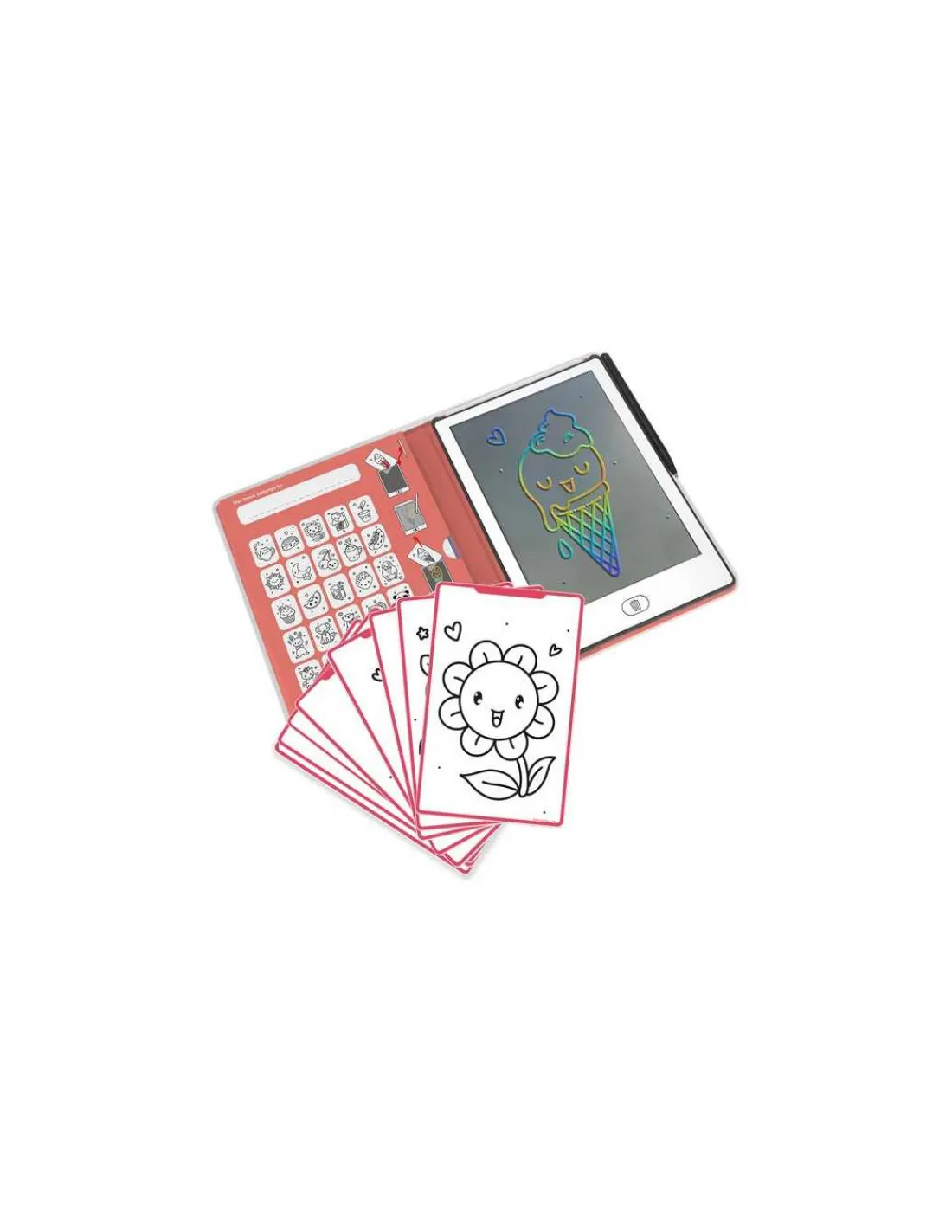 Le coffret comprend une tablette avec 30 dessins à décalquer avec un écran LCD de 8,2″ (Liquid Crystal Display), un bouton verrou pour sauver le dessin, un bouton pour effacer et un stylo.
