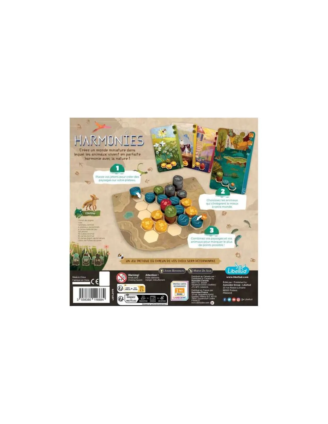 Découvrez le jeu Harmonies de Libellud, un jeu de stratégie pour jouer de 1 à 4 joueurs, à partir de 10 ans et dans lequel vous allez devoir créer un monde miniature dans lequel les animaux vivent en parfaite harmonie avec la nature ! Un jeu nommé dans la catégorie As d’or 2025 jeu catégorie initié.