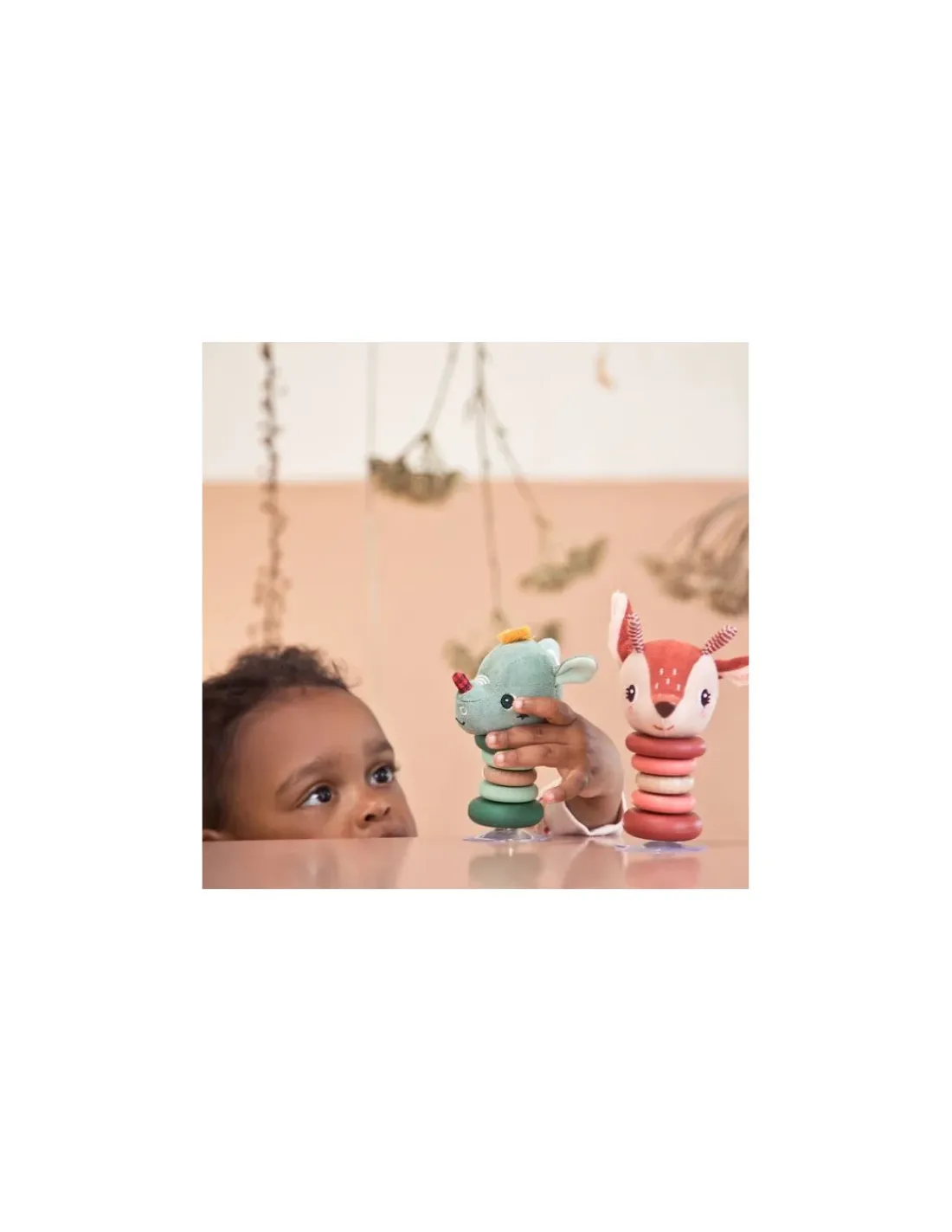 Ce hochet articulé se fixe très facilement sur toutes les surfaces grâce à sa ventouse. Composé de plusieurs matières, ce jouet amusant viendra stimuler les sens de votre enfant. Le corps de Joe le dragon se compose de plusieurs anneaux en bois, qui s’entrechoquent et créent ainsi un son et une ondulation. La tête de l’animal est en tissu et contient un hochet, que bébé pourra entendre en faisant bouger le jouet.