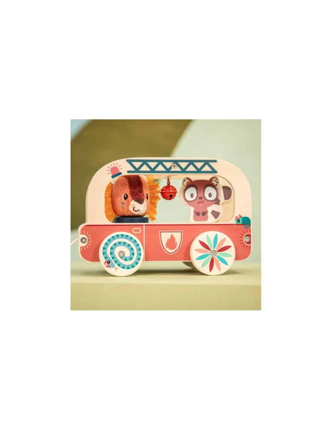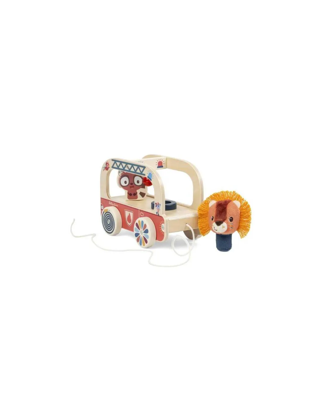 1, 2, 3… en avant! L’enfant pousse le camion et « Ding Ding », la clochette sonne! Elvis le lémurien tourne sur lui-même et la fait tinter en passant. Jack le lion, lui, peut sauter du camion pour une nouvelle mission de secours. Et quand l’enfant commence à marcher, une corde transforme le camion en jouet à tirer, prêt à foncer vers de nouvelles aventures!