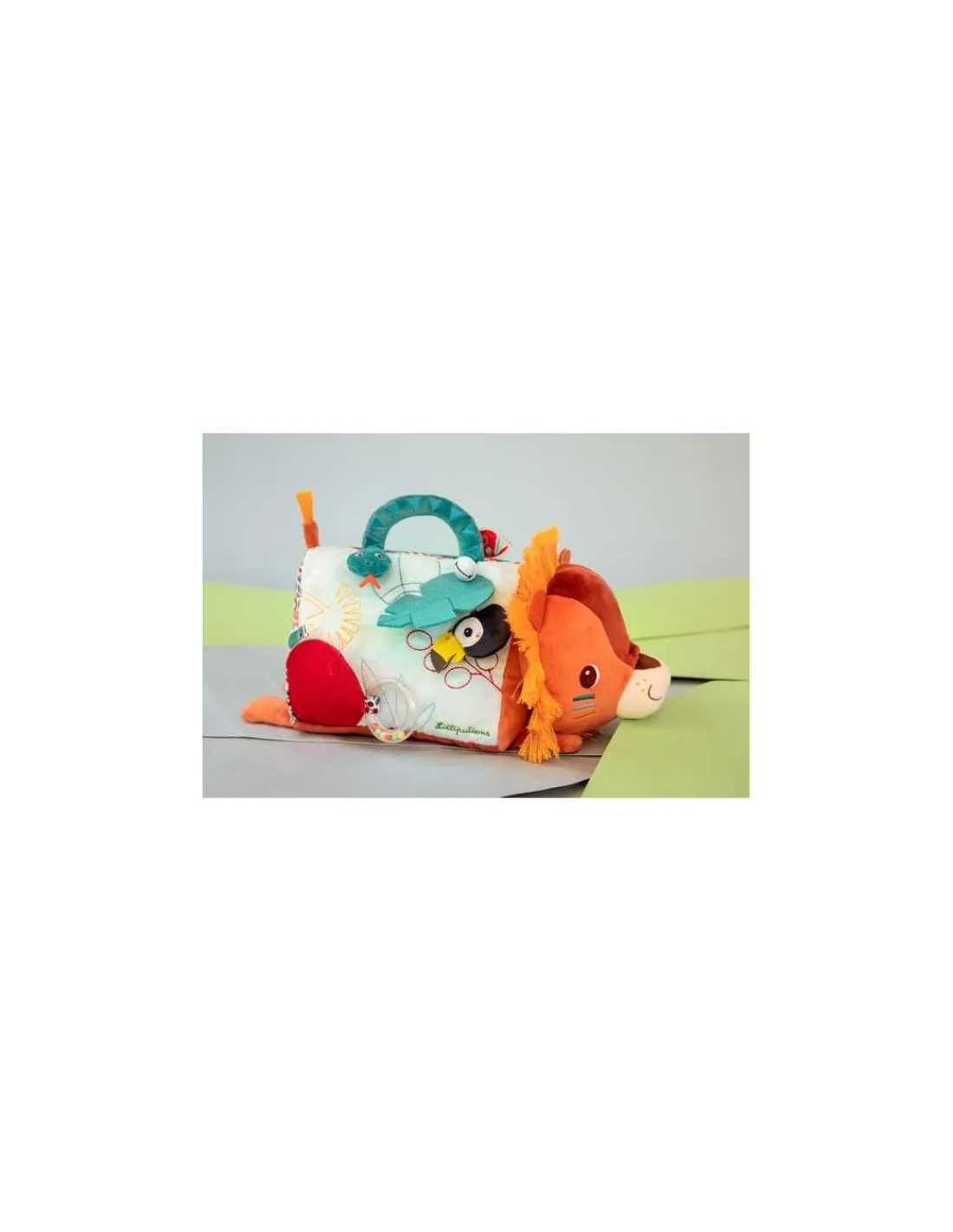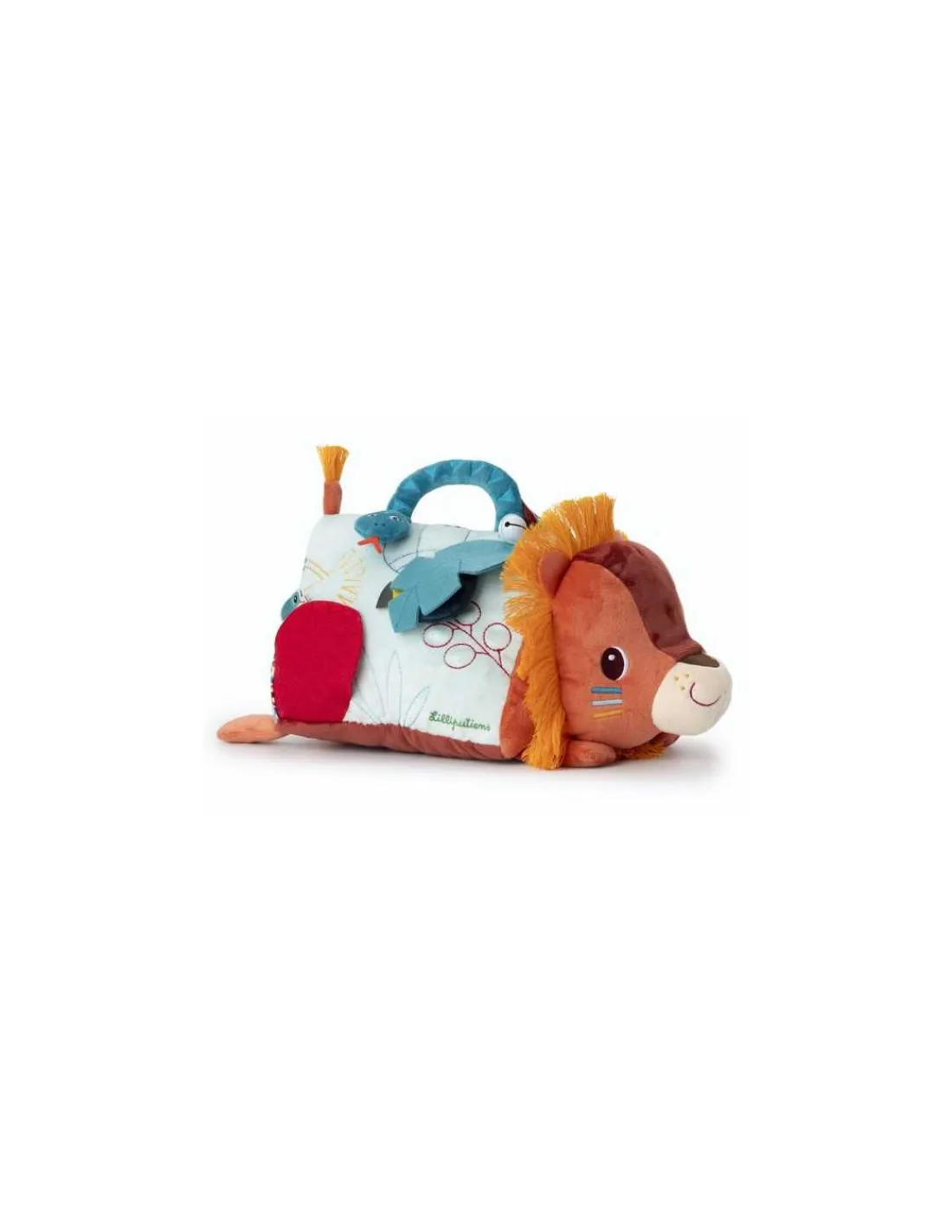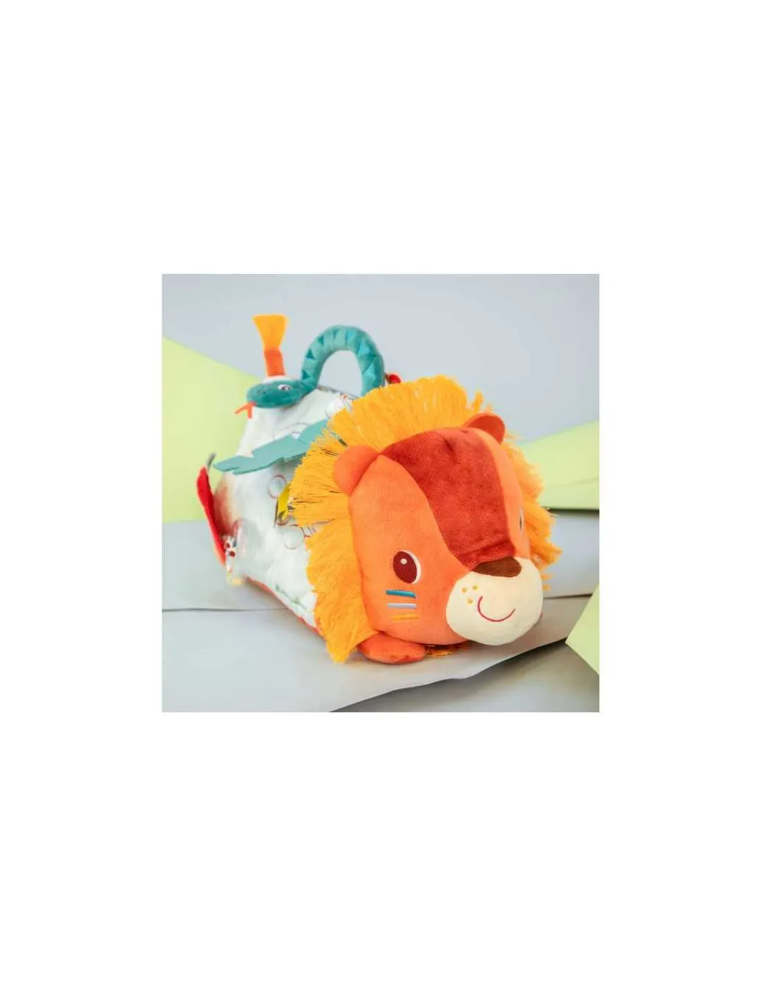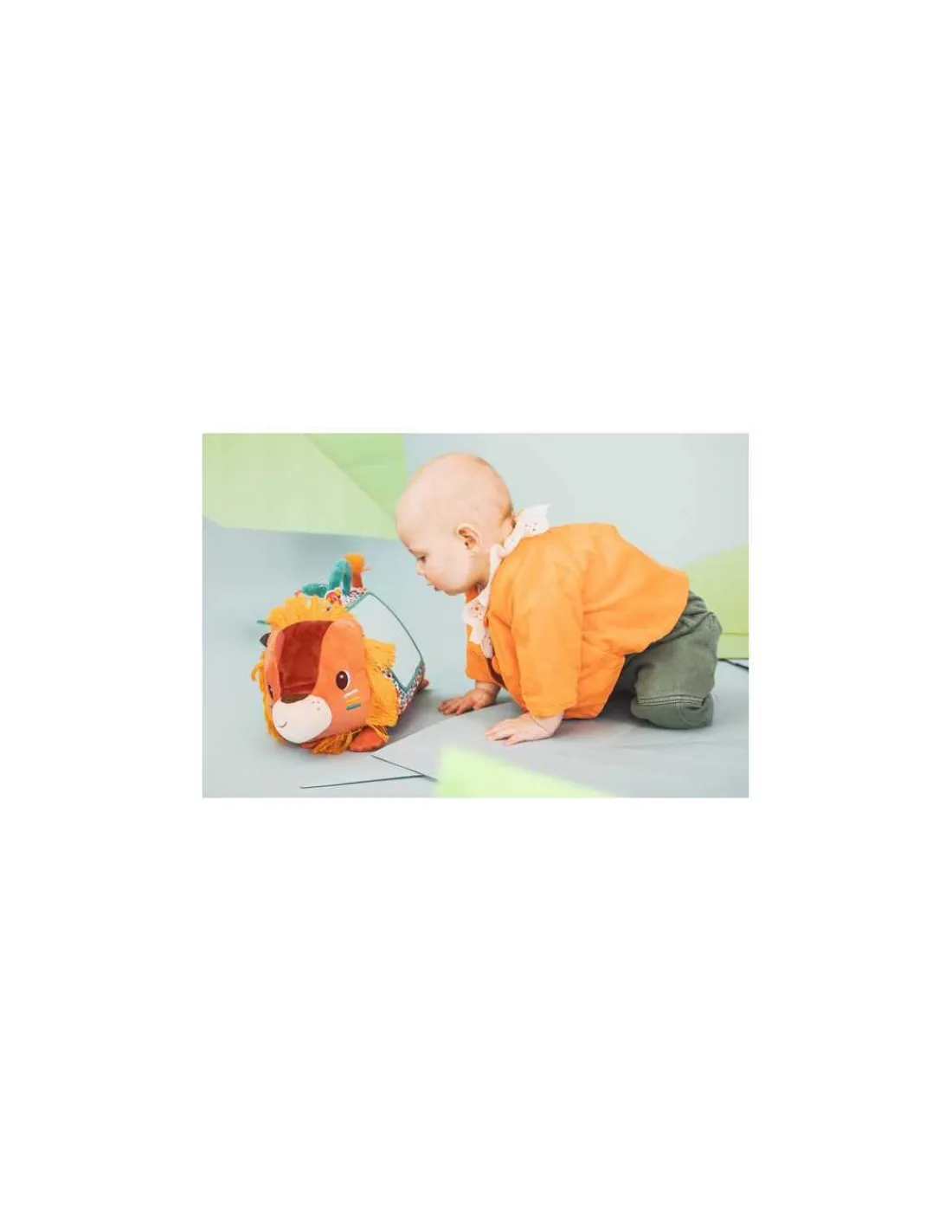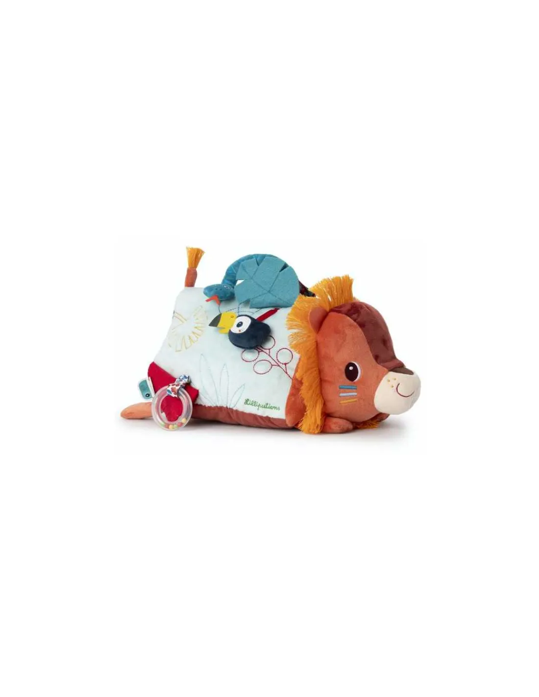 Le lion Jack, avec sa forme triangulaire, propose un grand miroir sur une face et une multitude d’activités sur l’autre. Ce jouet encourage l’éveil sensoriel des bébés grâce à des textures variées, des couleurs vives et des éléments tactiles. Sa crinière flamboyante, son grelot, son hochet à billes et Pablo le toucan assurent des heures de jeu captivant.