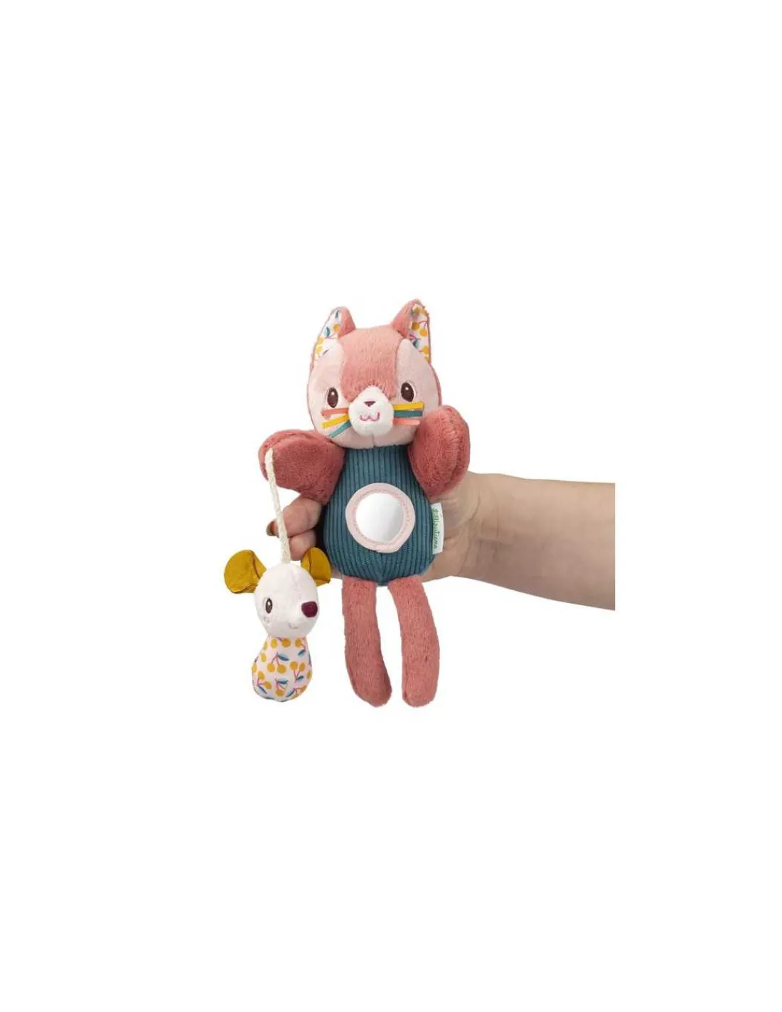 Cette petite marionnette est idéale pour divertir bébé. Avec son format pratique, on peut l’emporter partout avec soi pour la faire prendre vie. Pour cela, passez un doigt dans chaque bras de la marionnette et c’est parti pour le spectacle! Jeanne propose 3 activités pour divertir et stimuler les sens de votre bébé : un hochet situé au niveau de la tête, un miroir sur son ventre et son amis la souris qui crépite grâce à du papier bruissant.