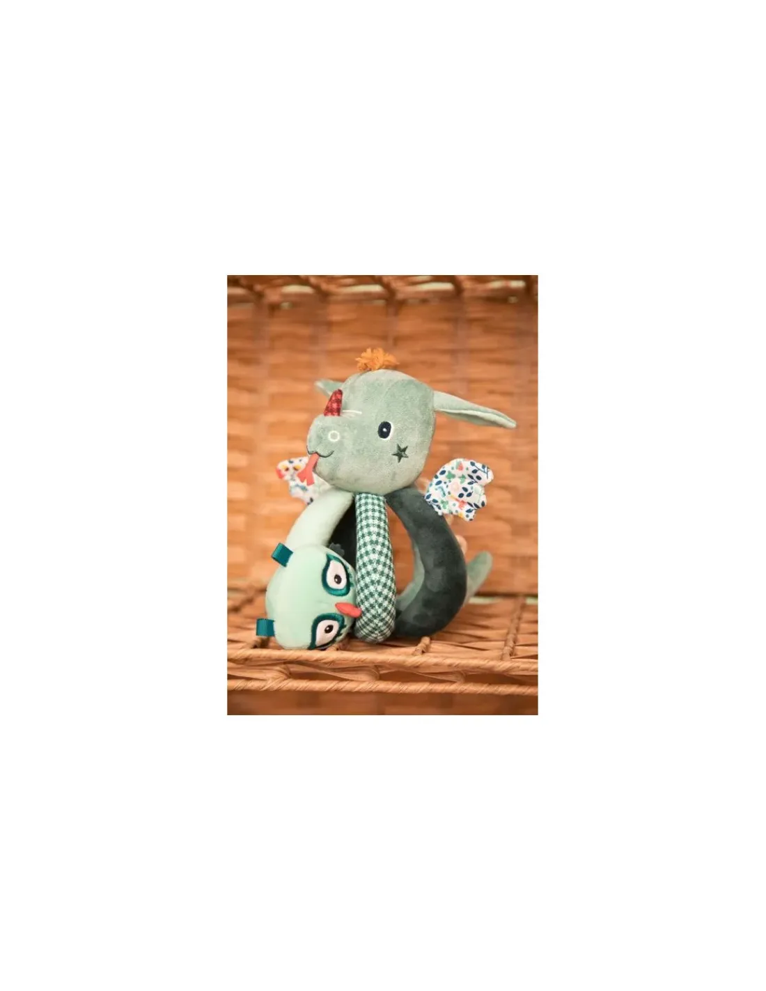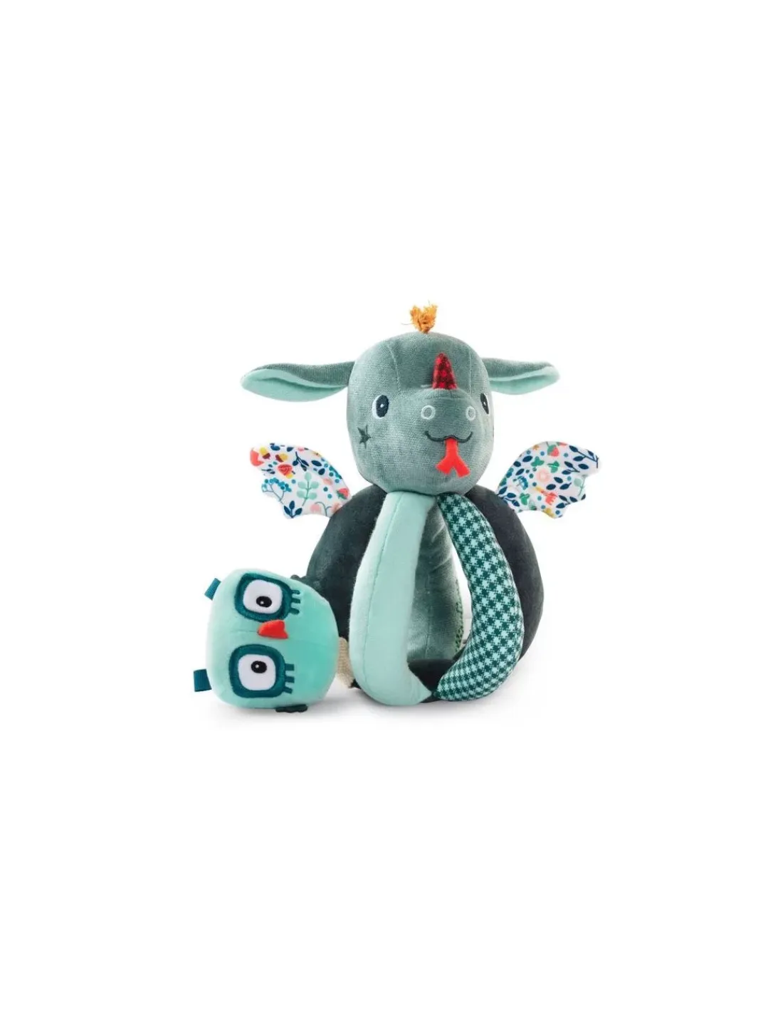 Un superbe hochet aux couleurs de Joe le dragon, qui offre un mélange de textures et de nombreuses activités pour éveiller bébé : des hochets, du papier bruissant, Merlin le hibou caché entre les poignées…