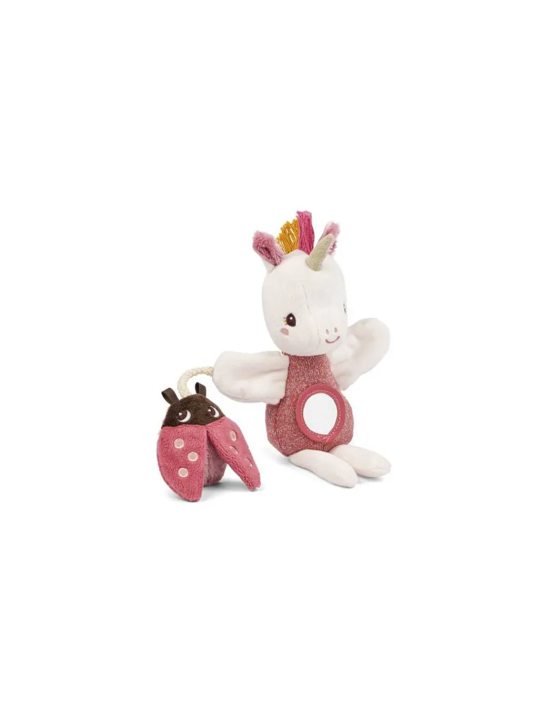 Léna propose 3 activités pour divertir et stimuler les sens de votre bébé : un hochet situé au niveau de la tête, un miroir sur son ventre et sa copine la coccinelle qui crépite grâce à du papier bruissant.